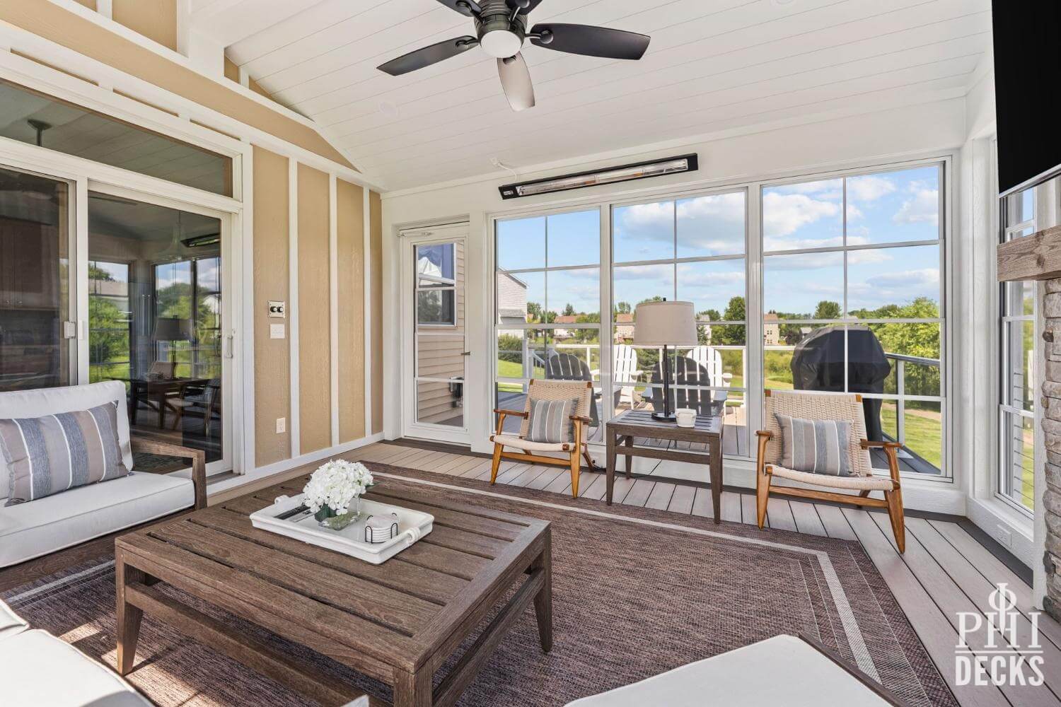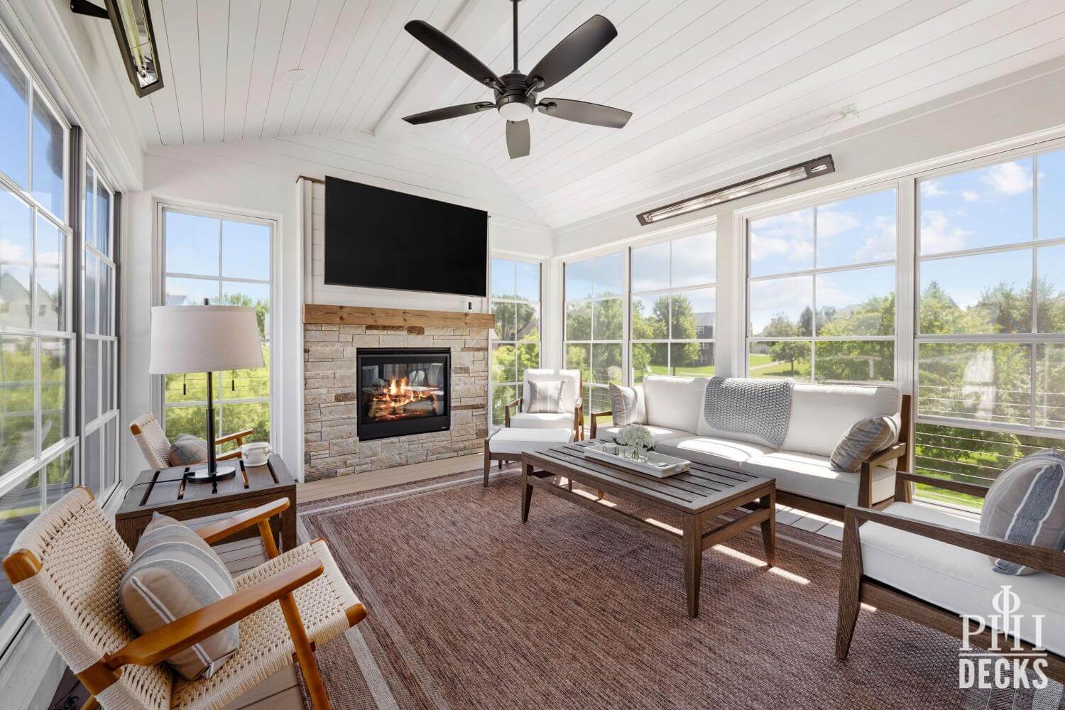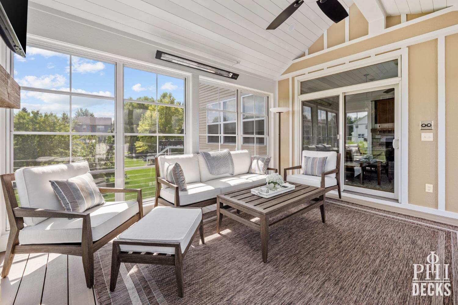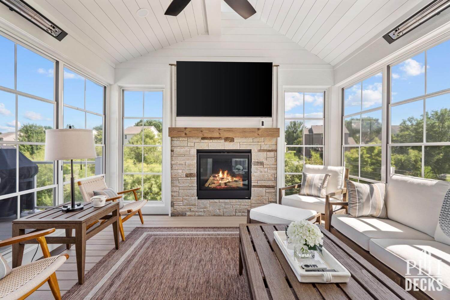 The Bianca Porch in Victoria, MN is a perfect example of an outdoor space that combines elegance with everyday function. At the heart of the design is a spacious three-season porch featuring vaulted trusses, a painted nickel gap wood ceiling, and large Xtend Vinyl-track windows that flood the space with natural light. A gas fireplace with stone cladding and a custom mantel creates a cozy gathering spot, while integrated heaters, ceiling fans, and thoughtful lighting make the porch comfortable year-round. Careful details, from the Snowscape White finishes to the matched siding, soffit, and trim, tie the new addition seamlessly to the home.