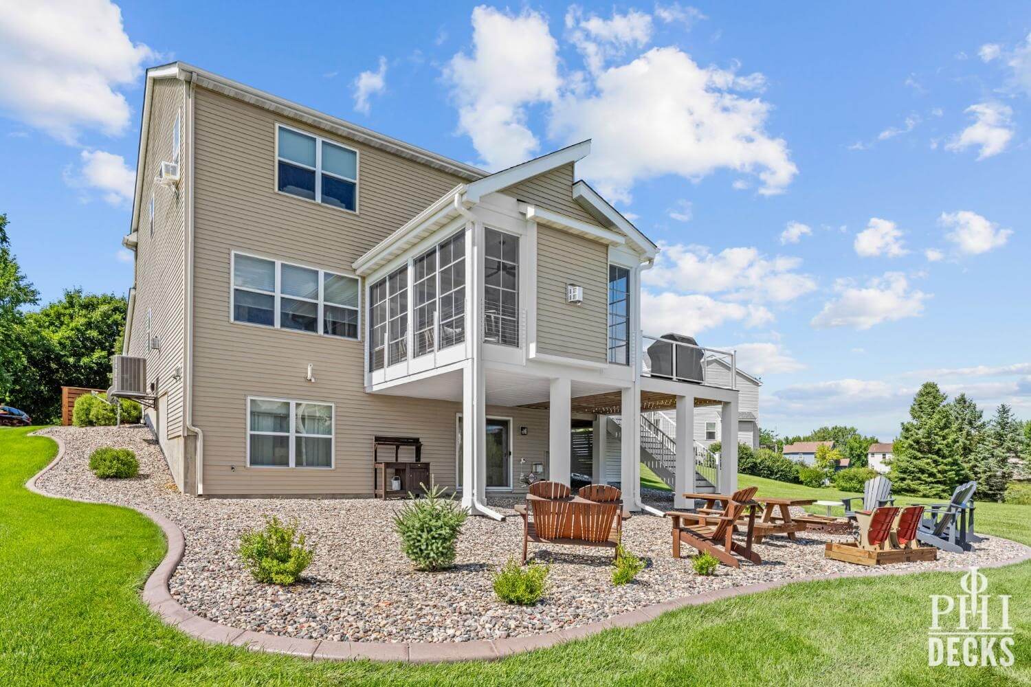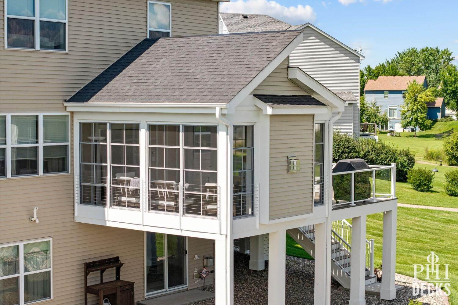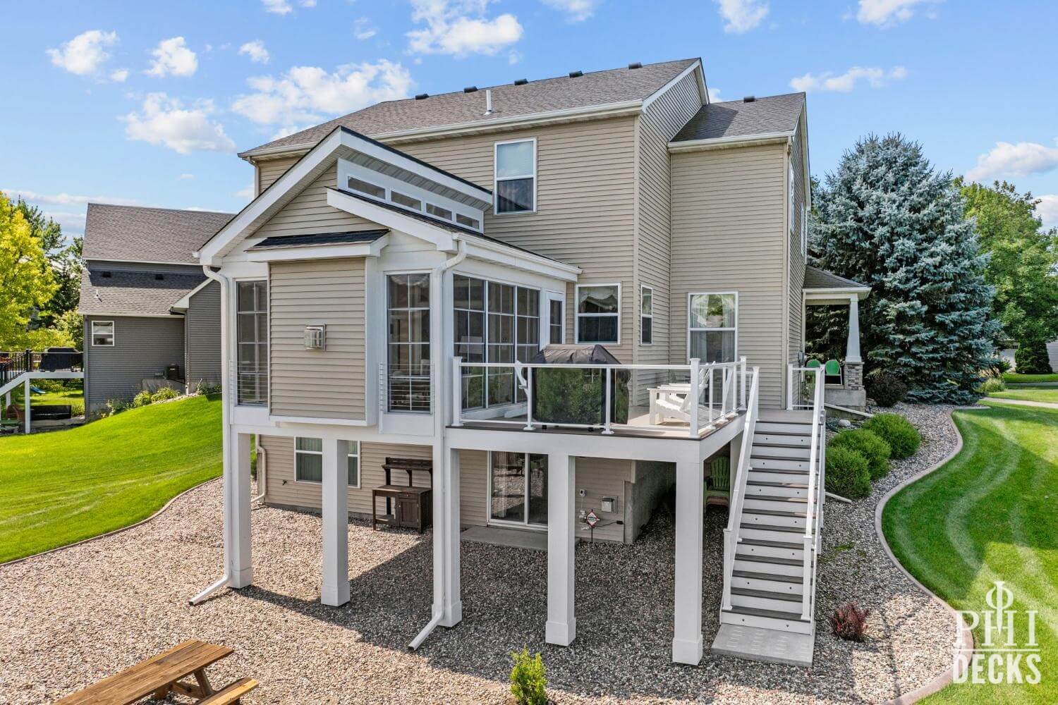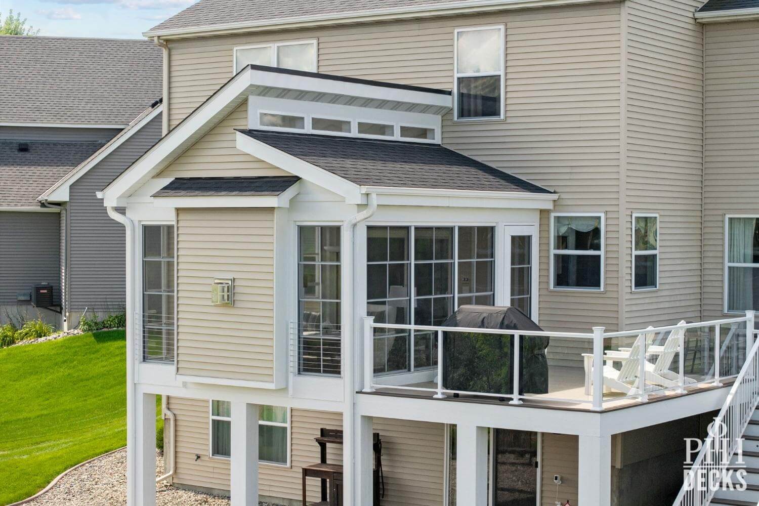 The Bianca Porch in Victoria, MN is a perfect example of an outdoor space that combines elegance with everyday function. At the heart of the design is a spacious three-season porch featuring vaulted trusses, a painted nickel gap wood ceiling, and large Xtend Vinyl-track windows that flood the space with natural light. A gas fireplace with stone cladding and a custom mantel creates a cozy gathering spot, while integrated heaters, ceiling fans, and thoughtful lighting make the porch comfortable year-round. Careful details, from the Snowscape White finishes to the matched siding, soffit, and trim, tie the new addition seamlessly to the home.