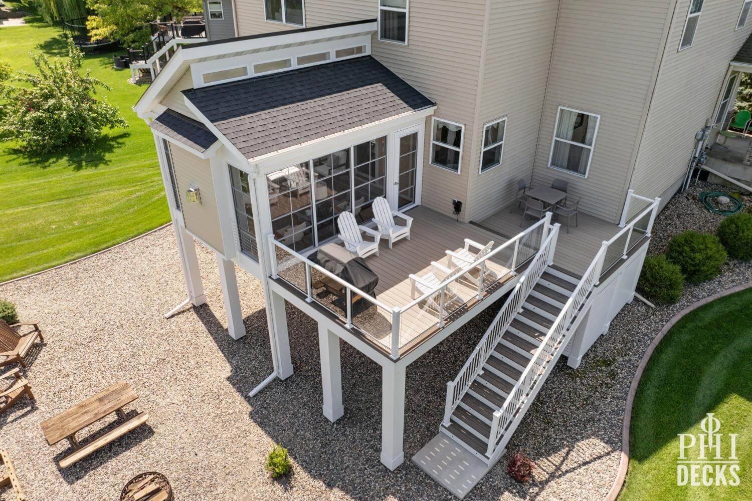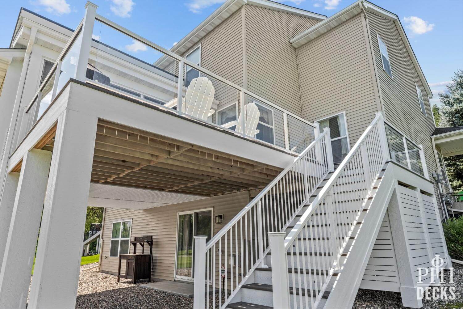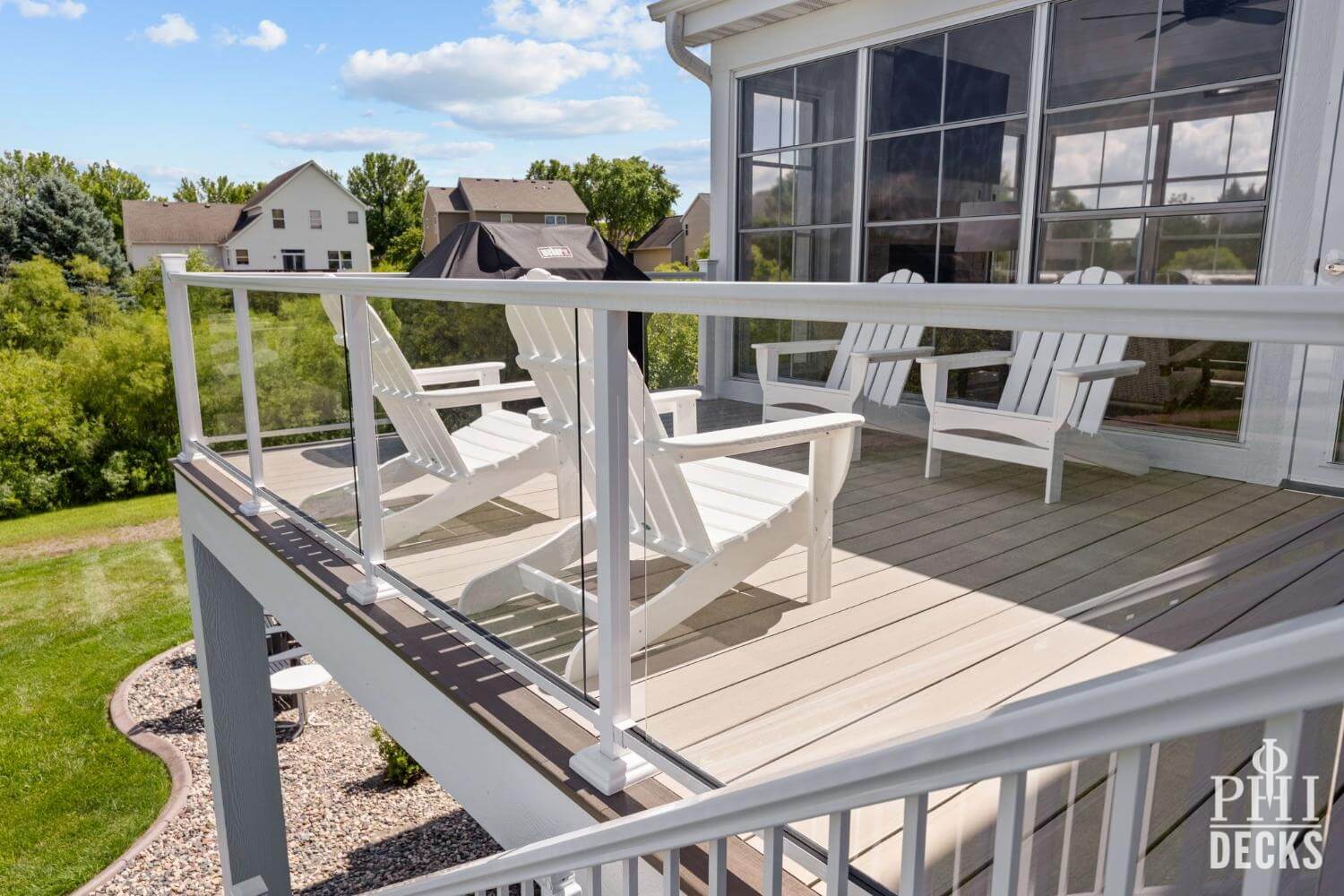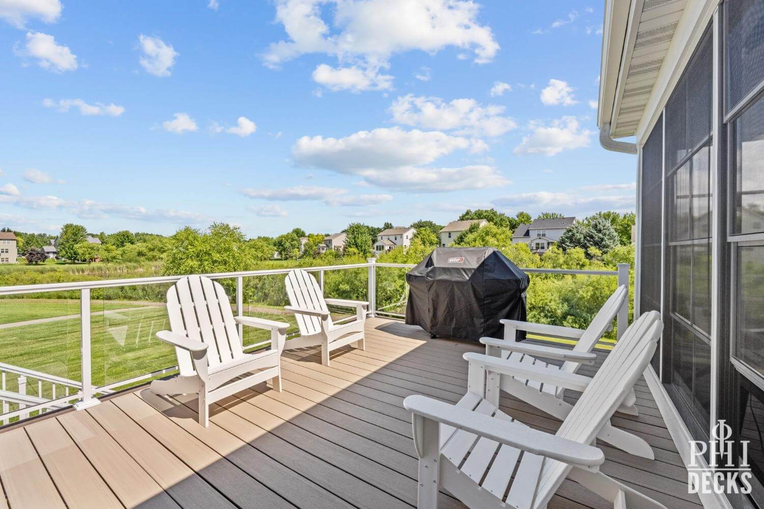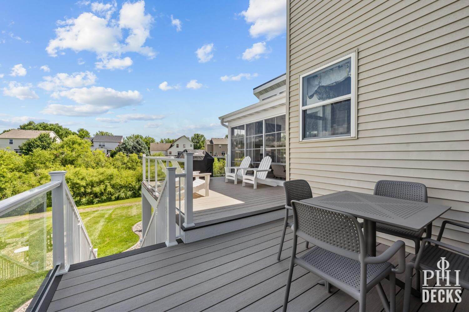 Extending beyond the porch, the outdoor living area features TimberTech Harvest Collection PVC decking in Brownstone with contrasting Kona accents. Sleek glass panel railings maintain open sightlines, while custom privacy screens, low voltage stair lighting, and an under deck ceiling system add both beauty and convenience. Every element, from gutters and trim to railing infill and electrical planning, was chosen for long-lasting quality and effortless enjoyment.