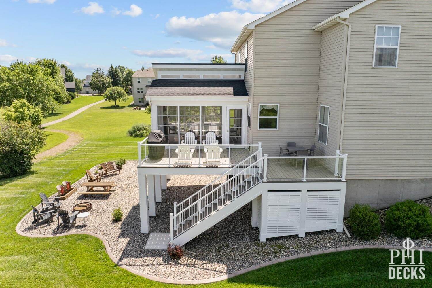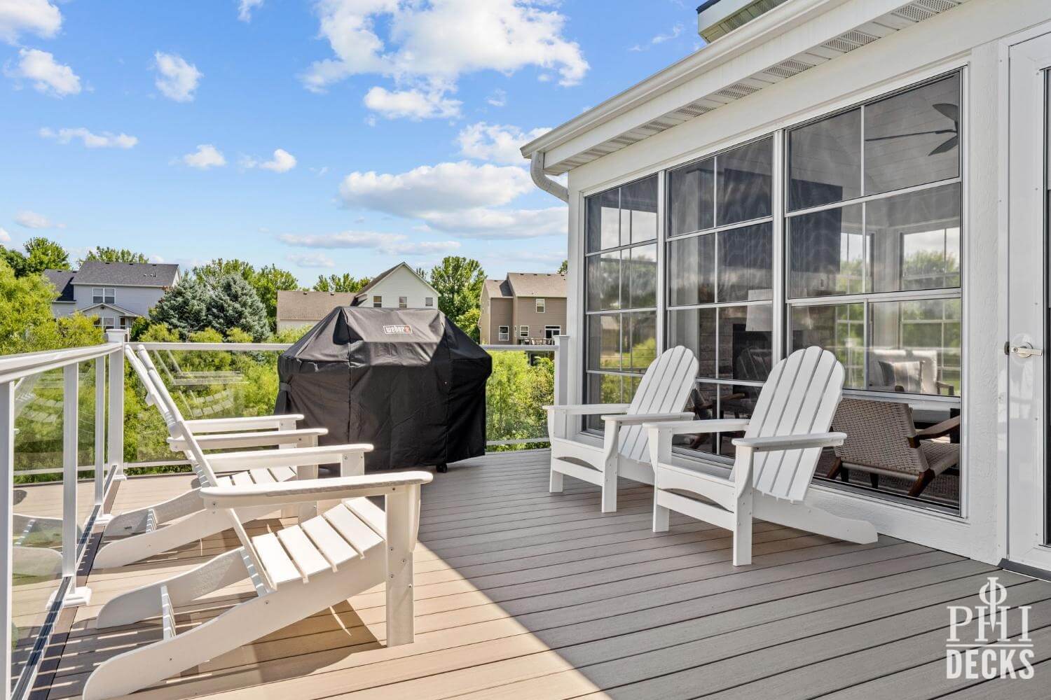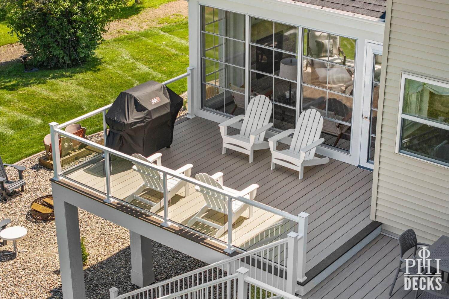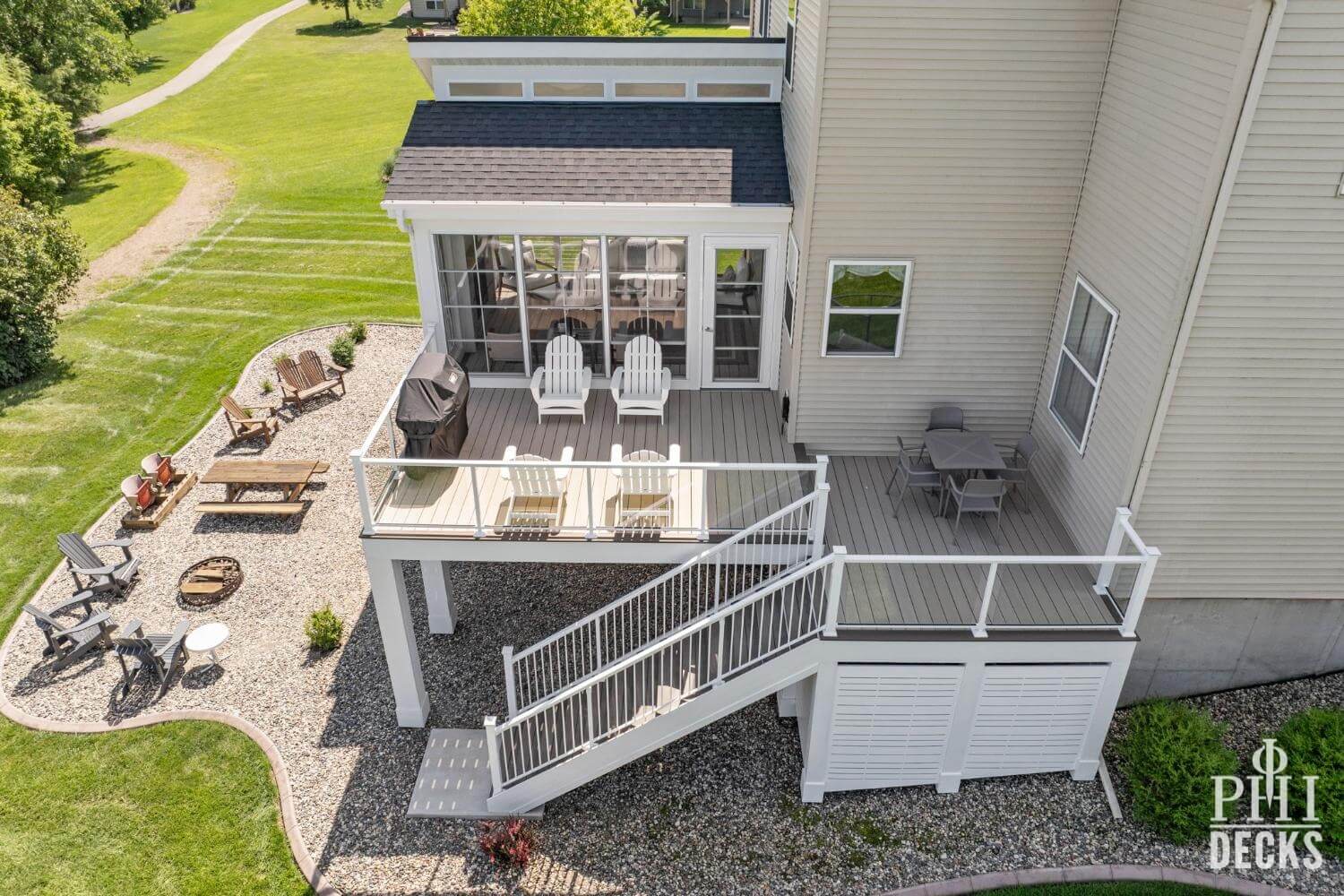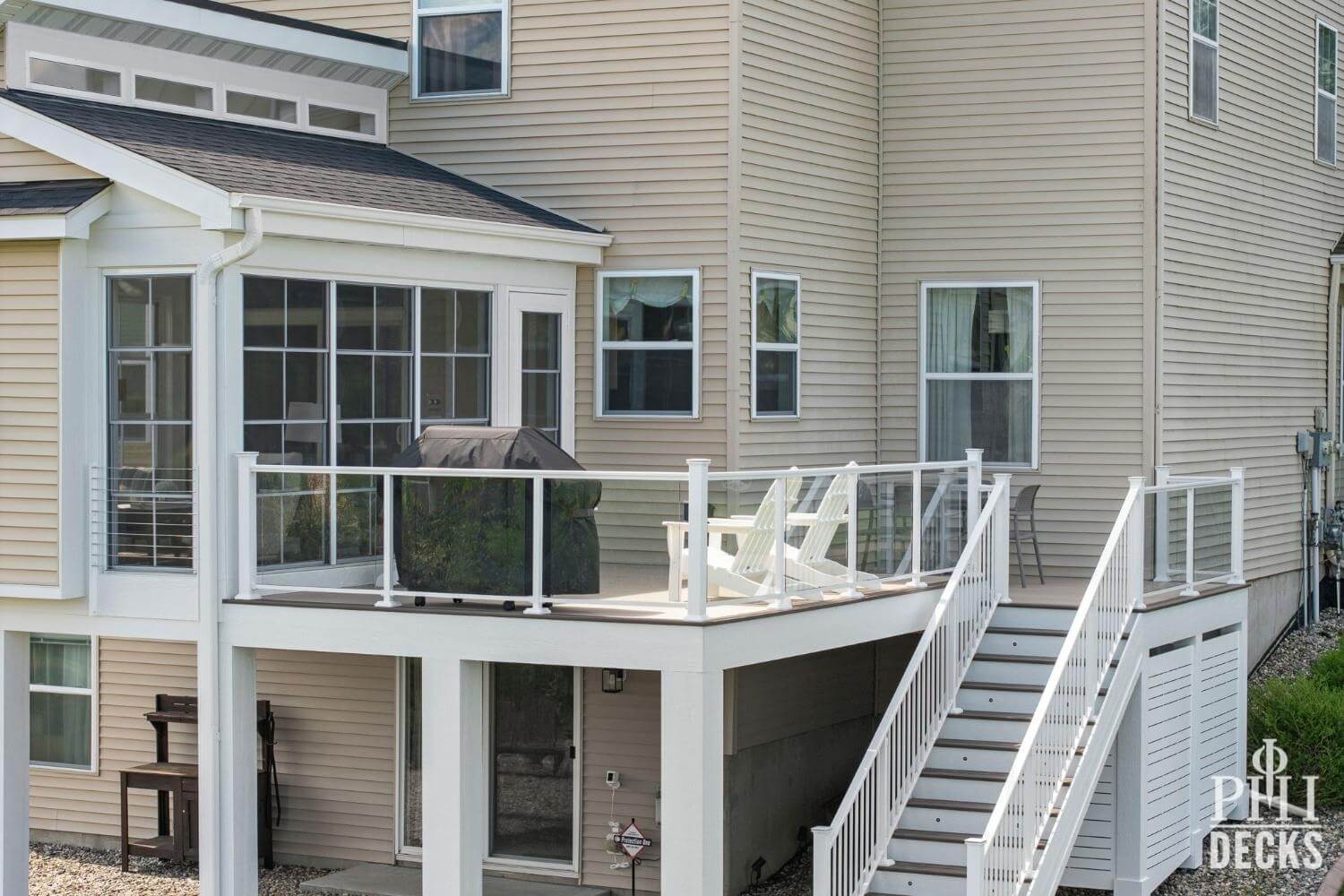 Extending beyond the porch, the outdoor living area features TimberTech Harvest Collection PVC decking in Brownstone with contrasting Kona accents. Sleek glass panel railings maintain open sightlines, while custom privacy screens, low voltage stair lighting, and an under deck ceiling system add both beauty and convenience. Every element, from gutters and trim to railing infill and electrical planning, was chosen for long-lasting quality and effortless enjoyment.