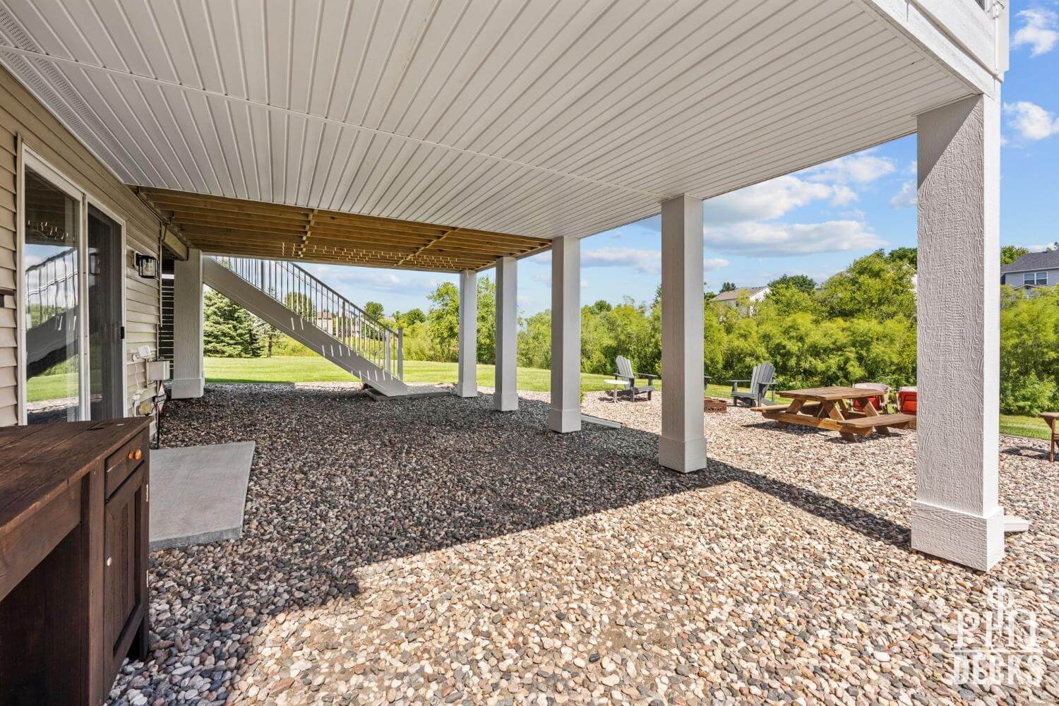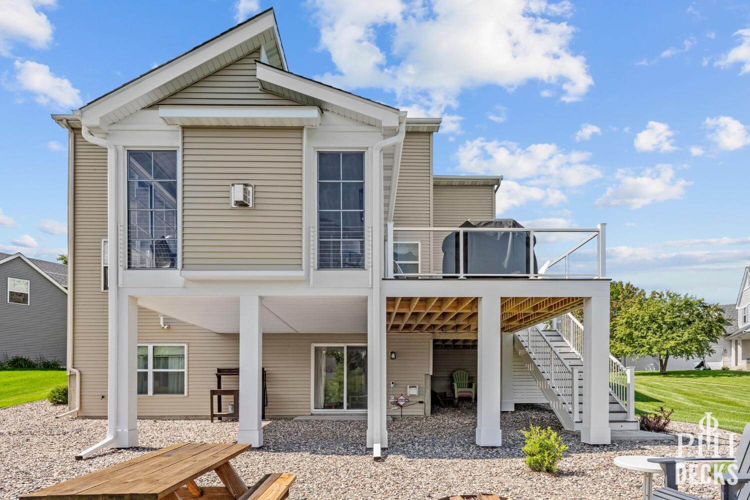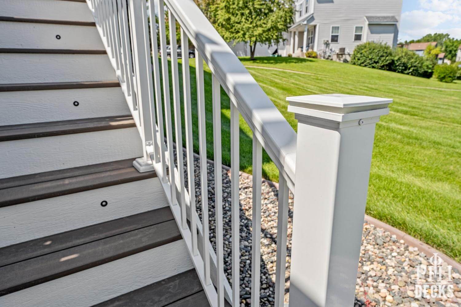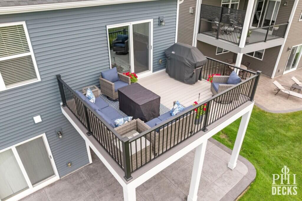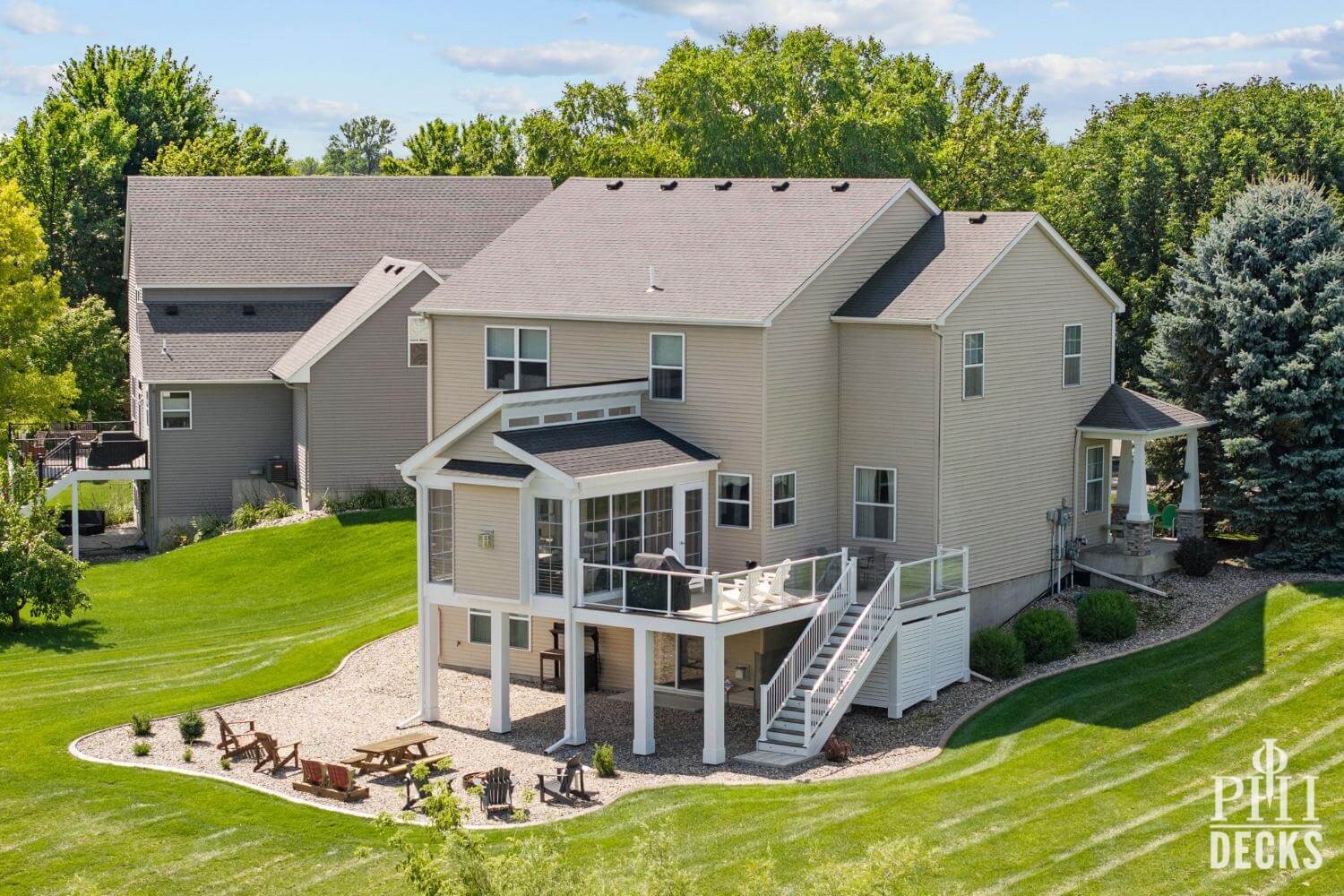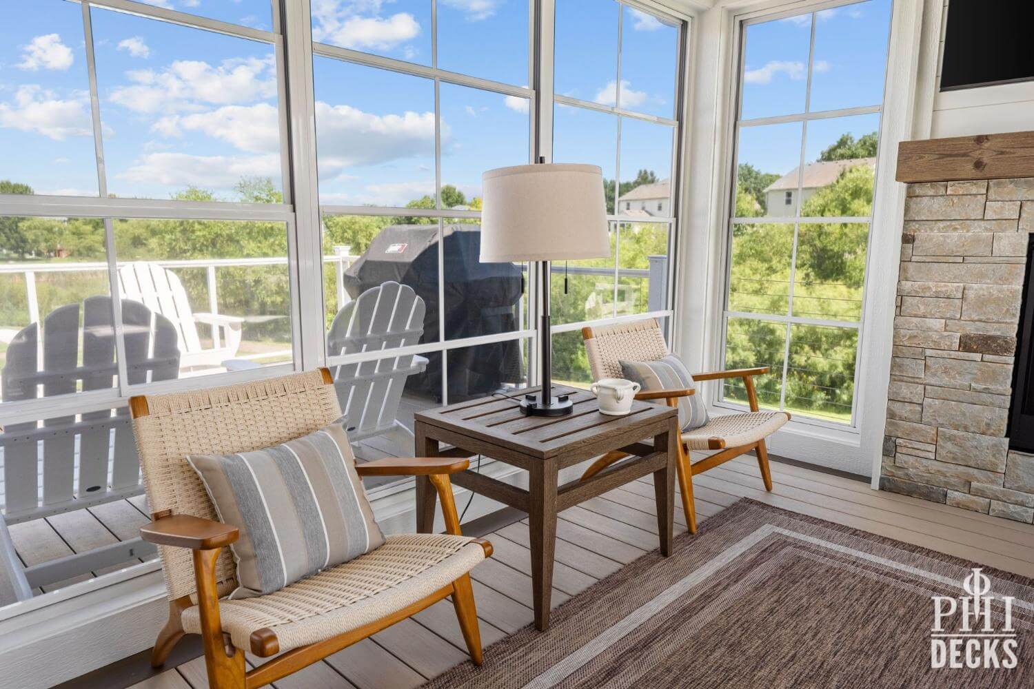 Extending beyond the porch, the outdoor living area features TimberTech Harvest Collection PVC decking in Brownstone with contrasting Kona accents. Sleek glass panel railings maintain open sightlines, while custom privacy screens, low voltage stair lighting, and an under deck ceiling system add both beauty and convenience. Every element, from gutters and trim to railing infill and electrical planning, was chosen for long-lasting quality and effortless enjoyment.