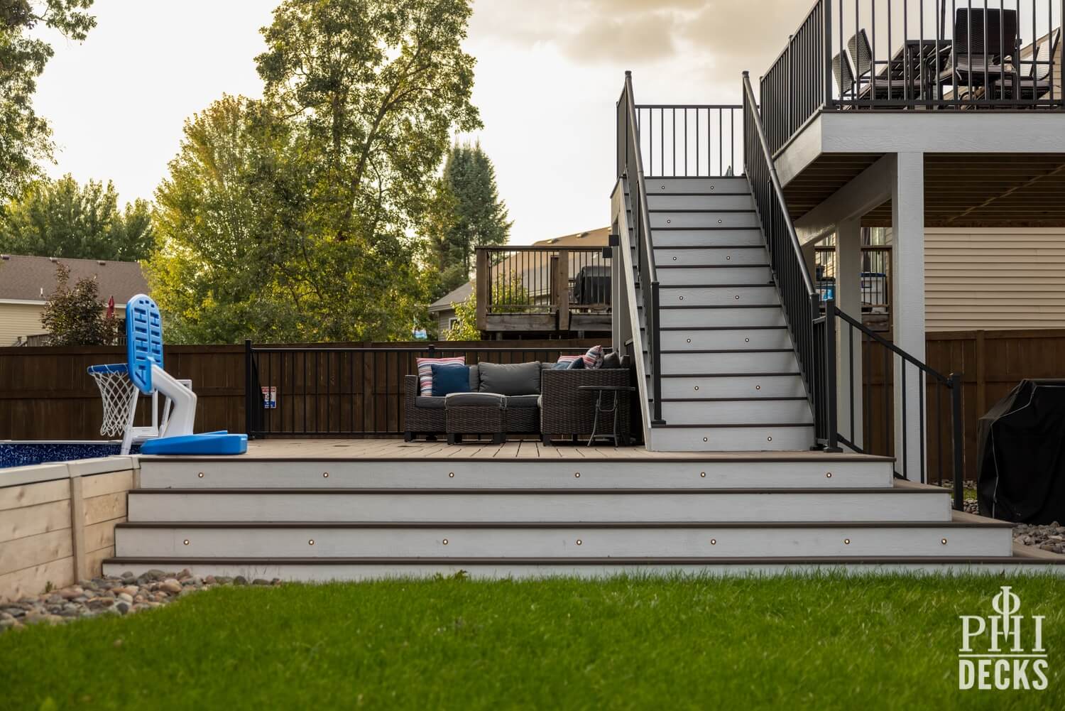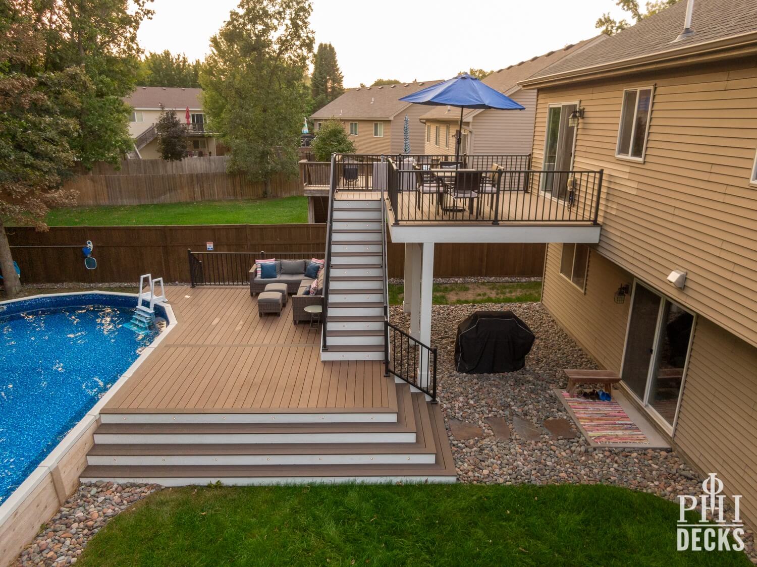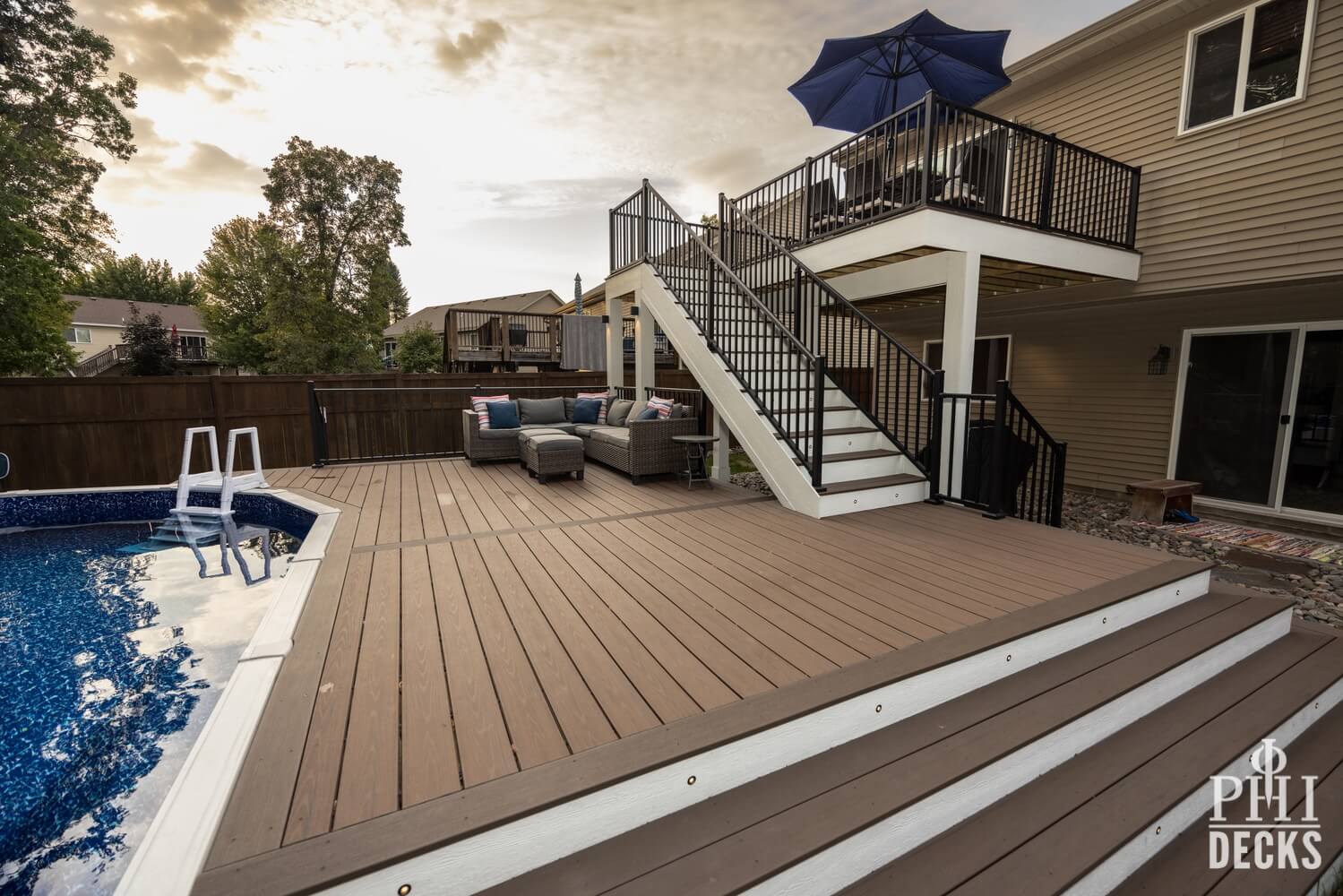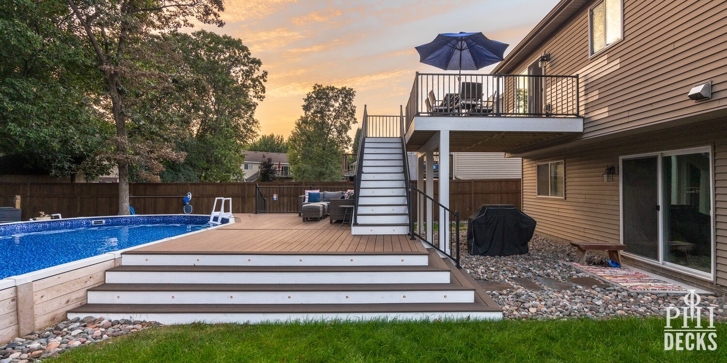 Thoughtfully designed for both relaxation and entertaining, the Northwood Deck offers a seamless blend of form and function across two beautifully connected levels. The upper 16′ x 14′ deck provides a quiet vantage point, while graceful stairs lead to an expansive lower deck that surrounds the pool, creating a natural setting for both serene moments and lively gatherings. TimberTech composite decking in Dark Cocoa and Brown Oak brings warmth and durability, complemented by Westbury Tuscany Series aluminum railing in a textured black finish for a clean, unobstructed view.