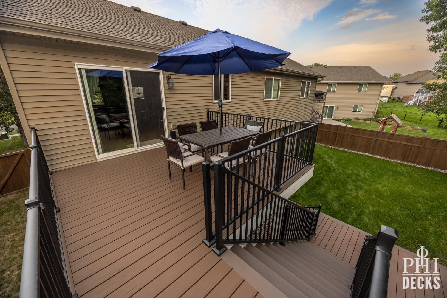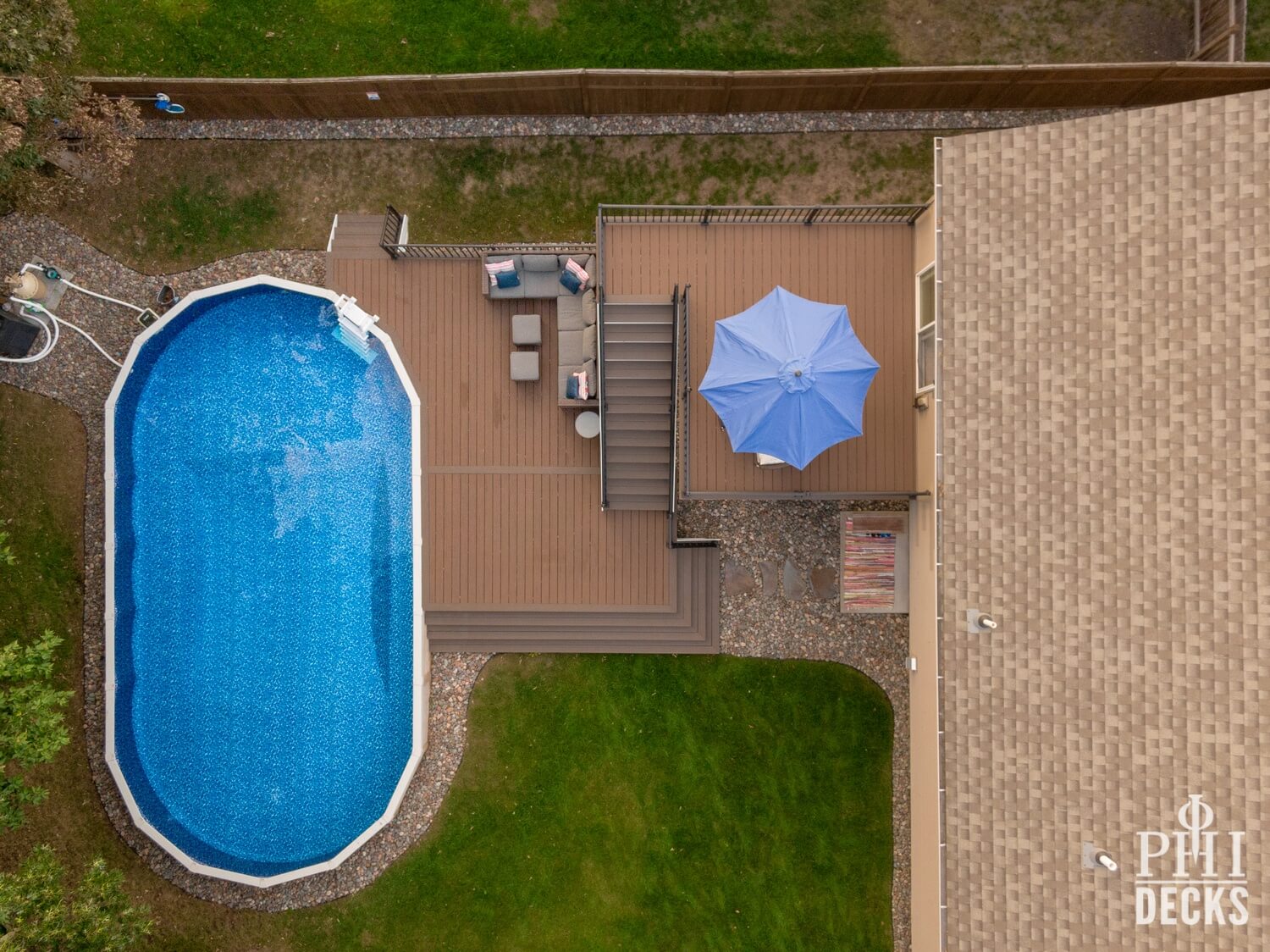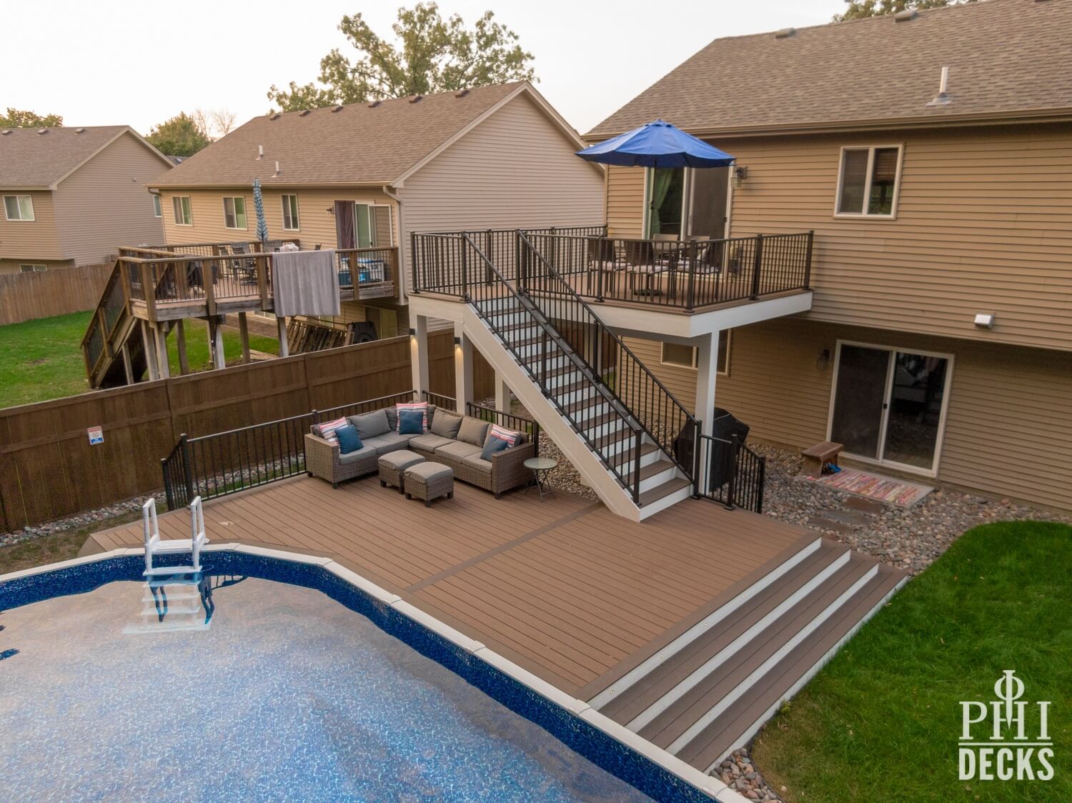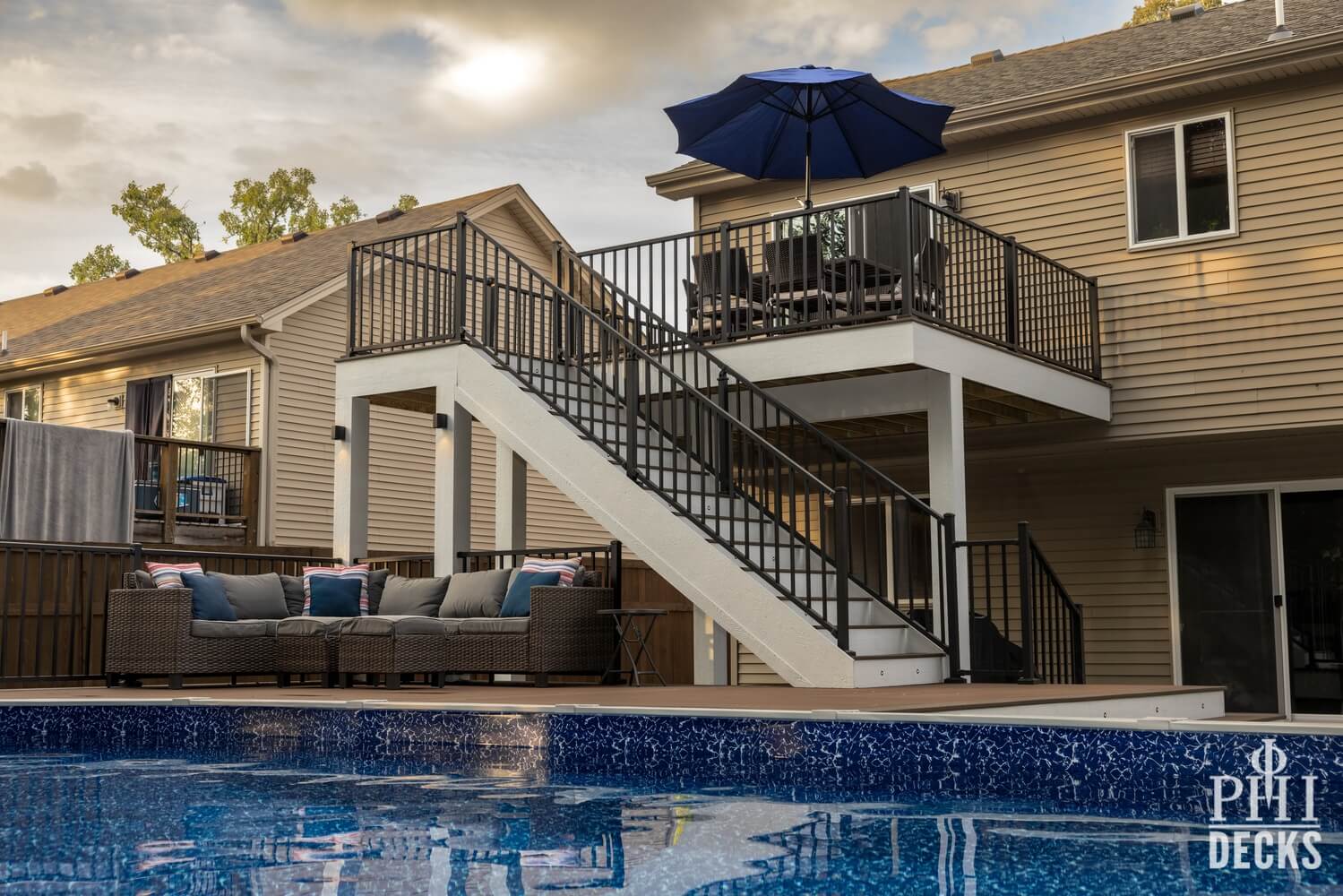 Thoughtfully designed for both relaxation and entertaining, the Northwood Deck offers a seamless blend of form and function across two beautifully connected levels. The upper 16′ x 14′ deck provides a quiet vantage point, while graceful stairs lead to an expansive lower deck that surrounds the pool, creating a natural setting for both serene moments and lively gatherings. TimberTech composite decking in Dark Cocoa and Brown Oak brings warmth and durability, complemented by Westbury Tuscany Series aluminum railing in a textured black finish for a clean, unobstructed view.