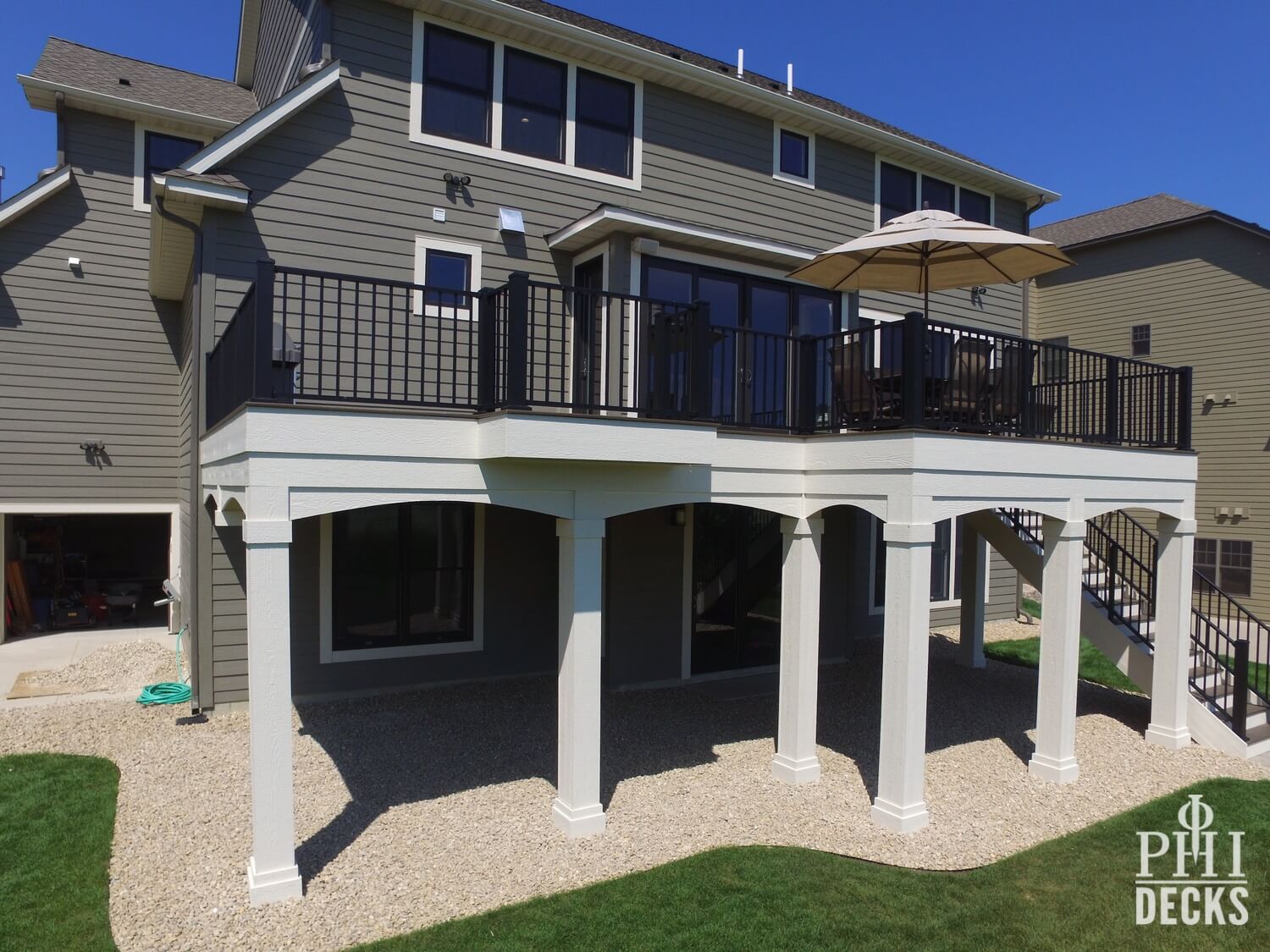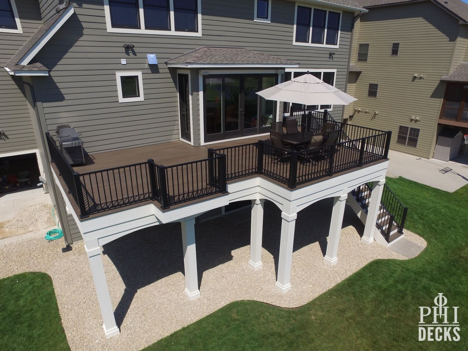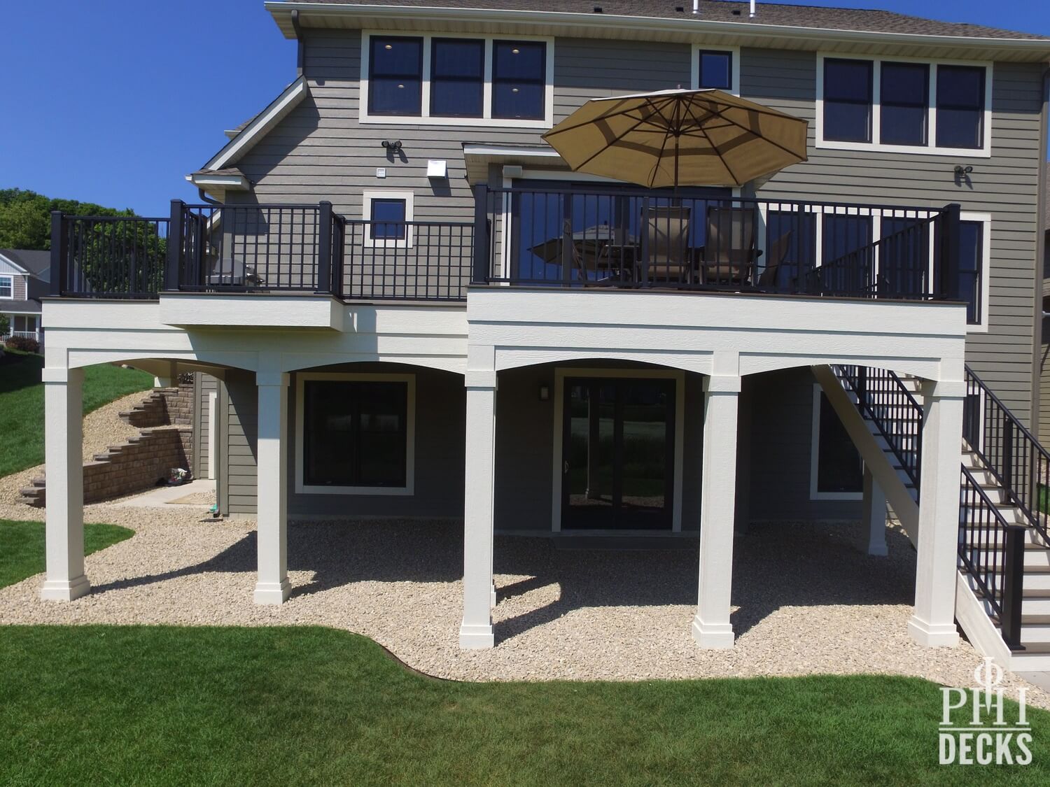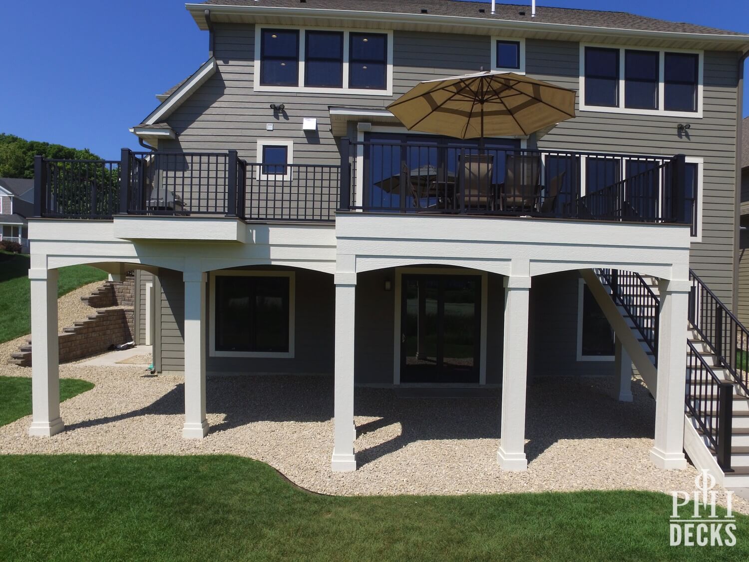 Architectural details define the design. Oversized columns, custom arches, and a multi-tier fascia system introduce depth and visual interest, giving the deck a strong presence and undeniable curb appeal.