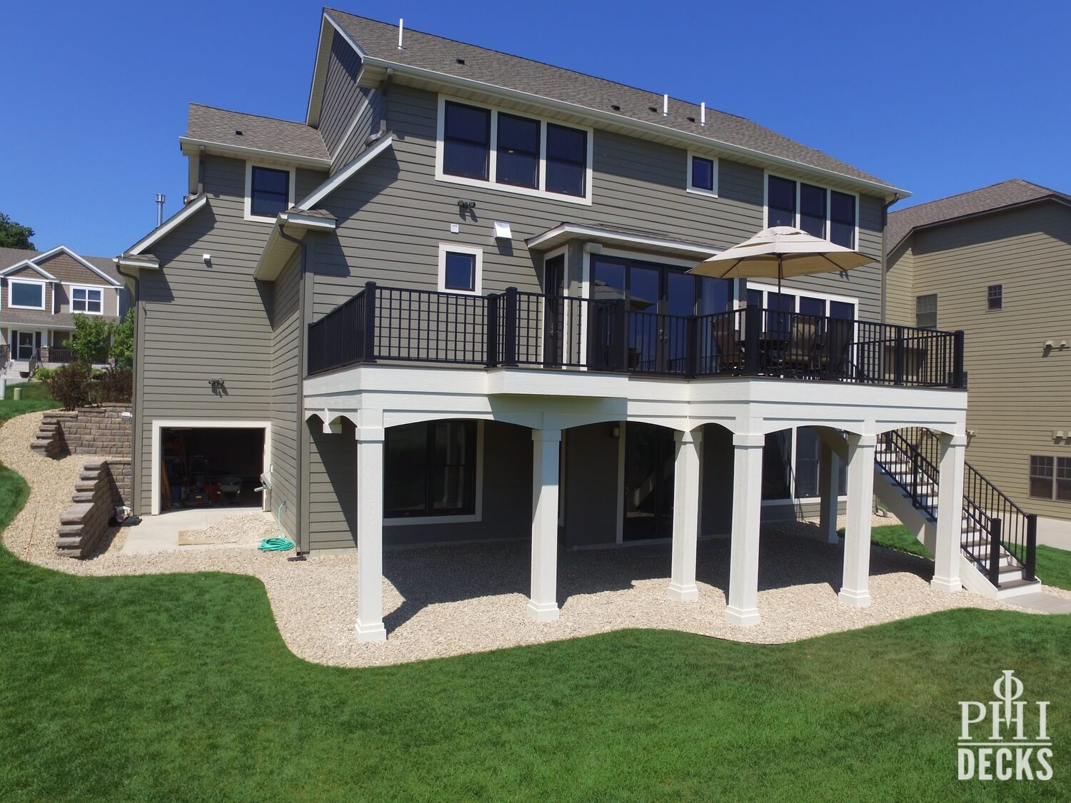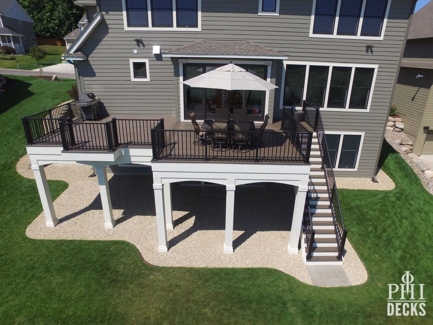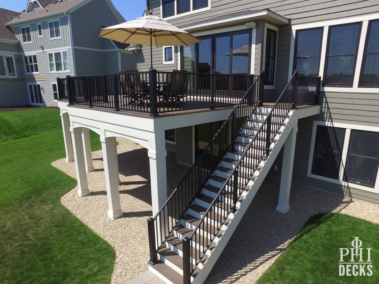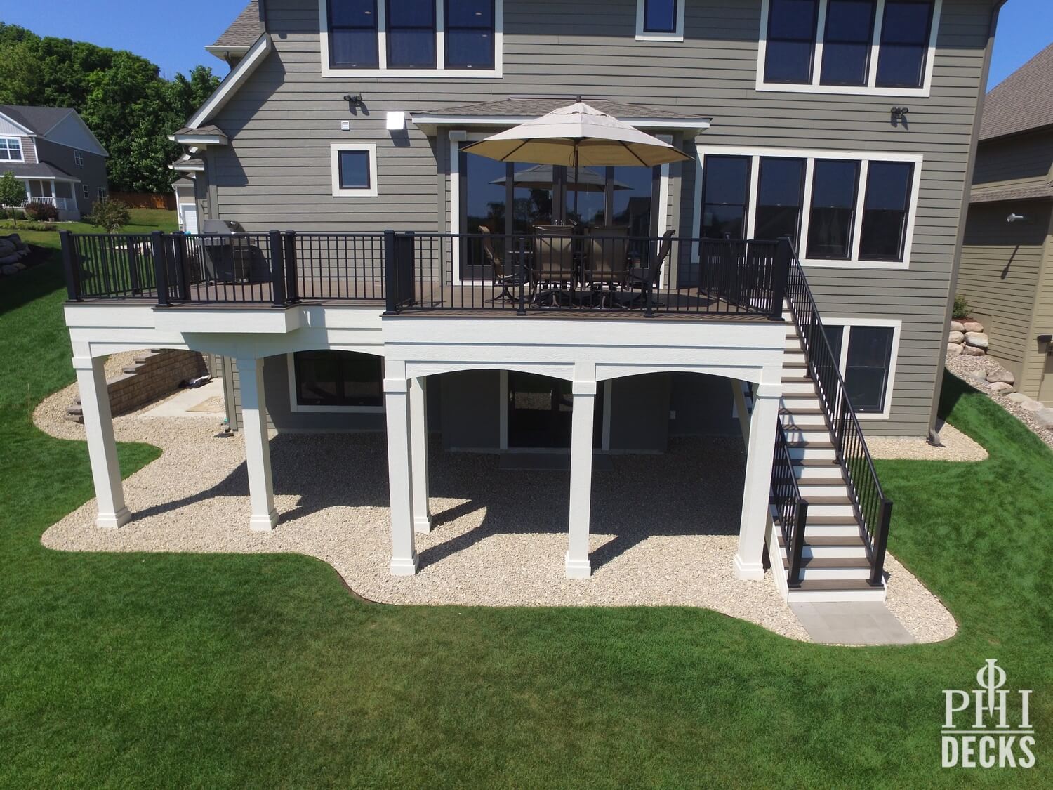 Architectural details define the design. Oversized columns, custom arches, and a multi-tier fascia system introduce depth and visual interest, giving the deck a strong presence and undeniable curb appeal.