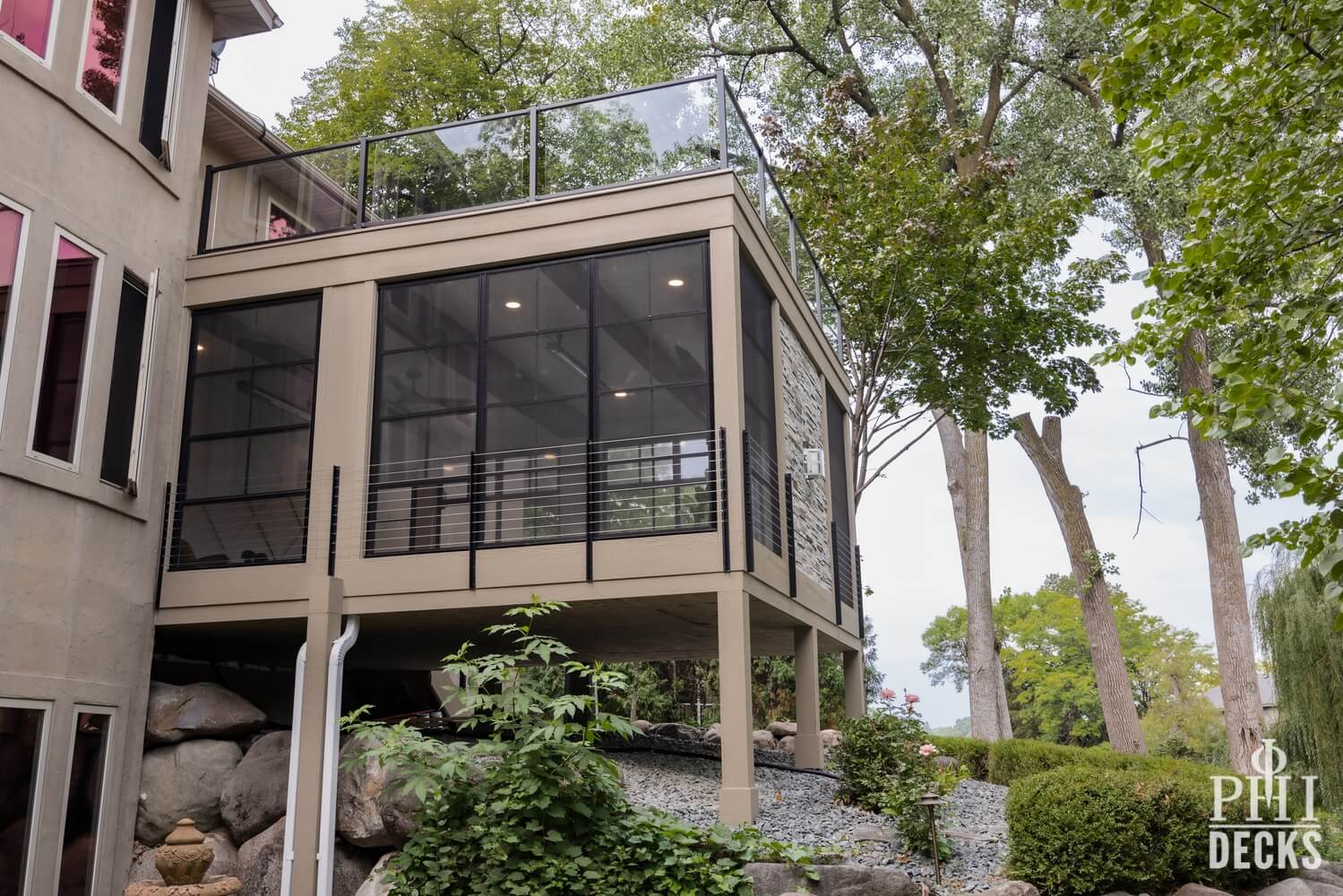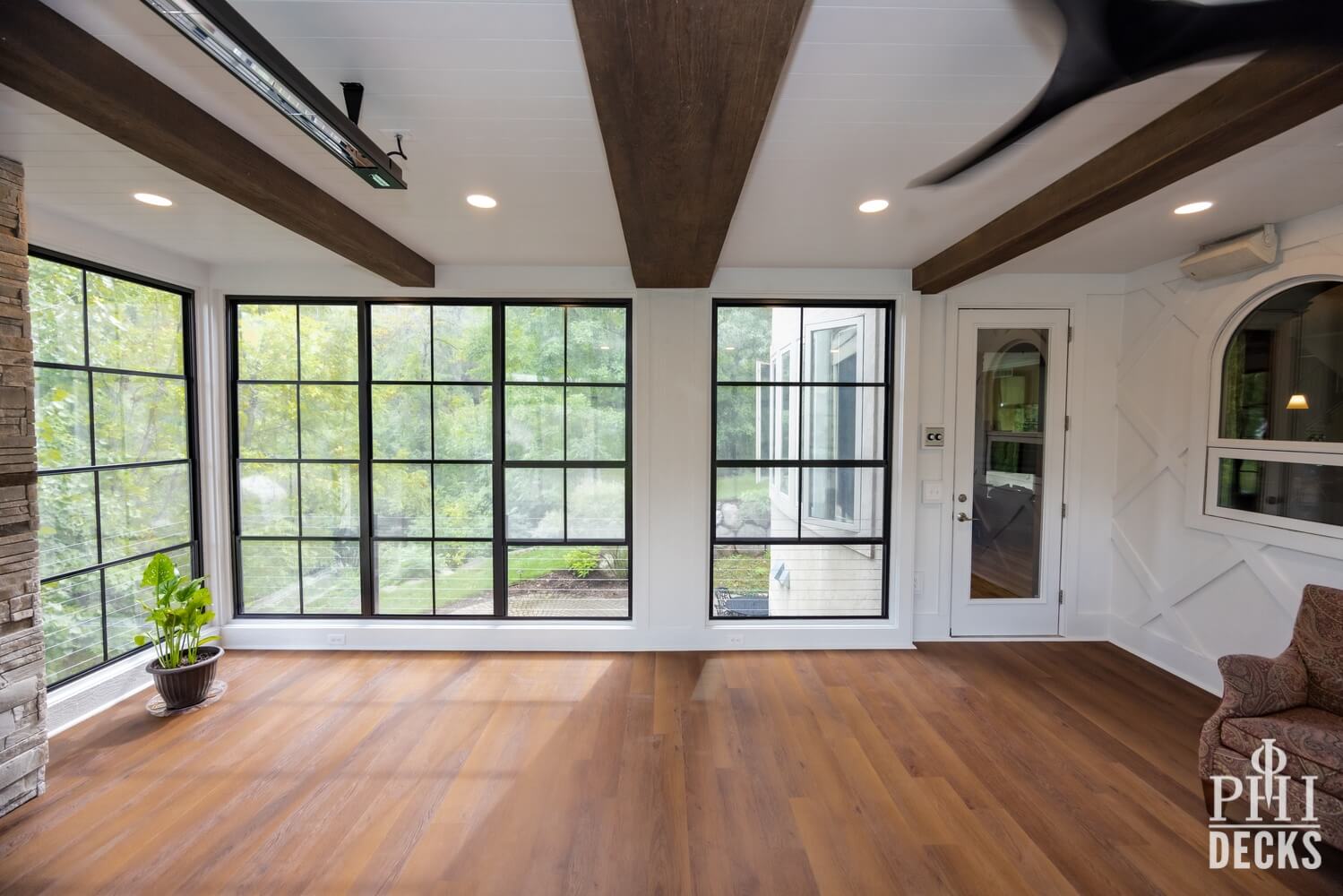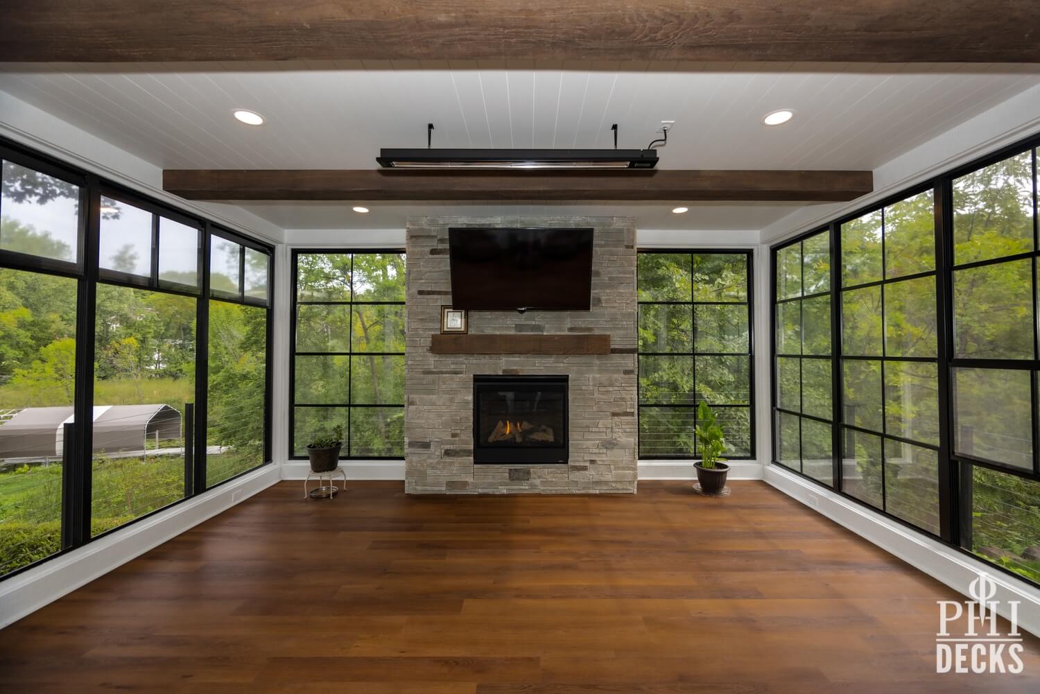 The Stone Ridge Porch is a stunning elevated retreat designed to blend warmth, structure, and sweeping views into one seamless outdoor living experience. Set atop a natural ridge, this three-season porch features expansive, black-framed windows that invite in light while maintaining a strong architectural presence.