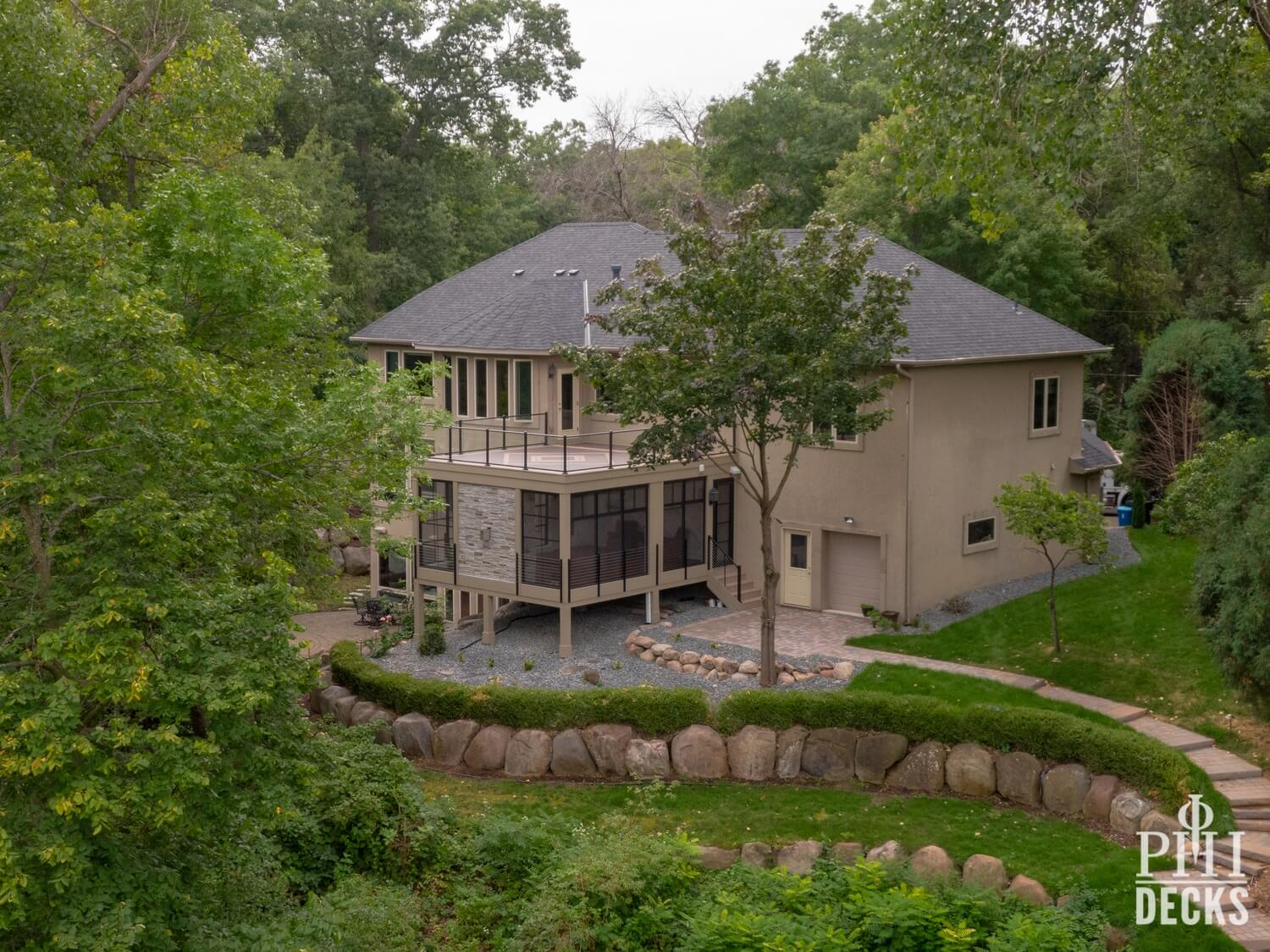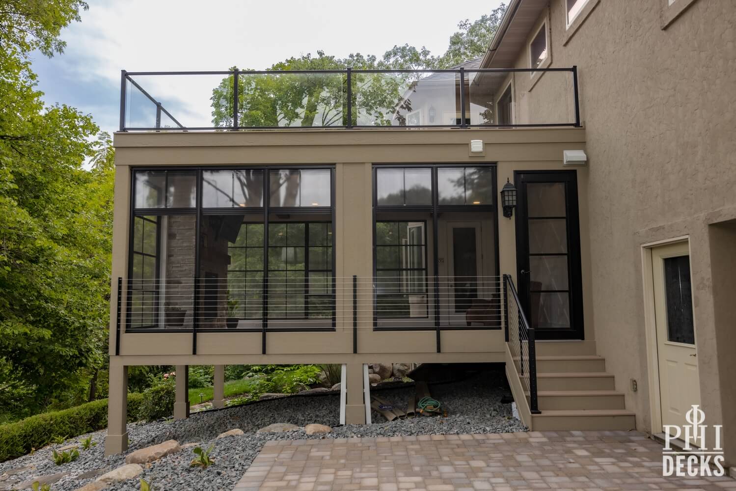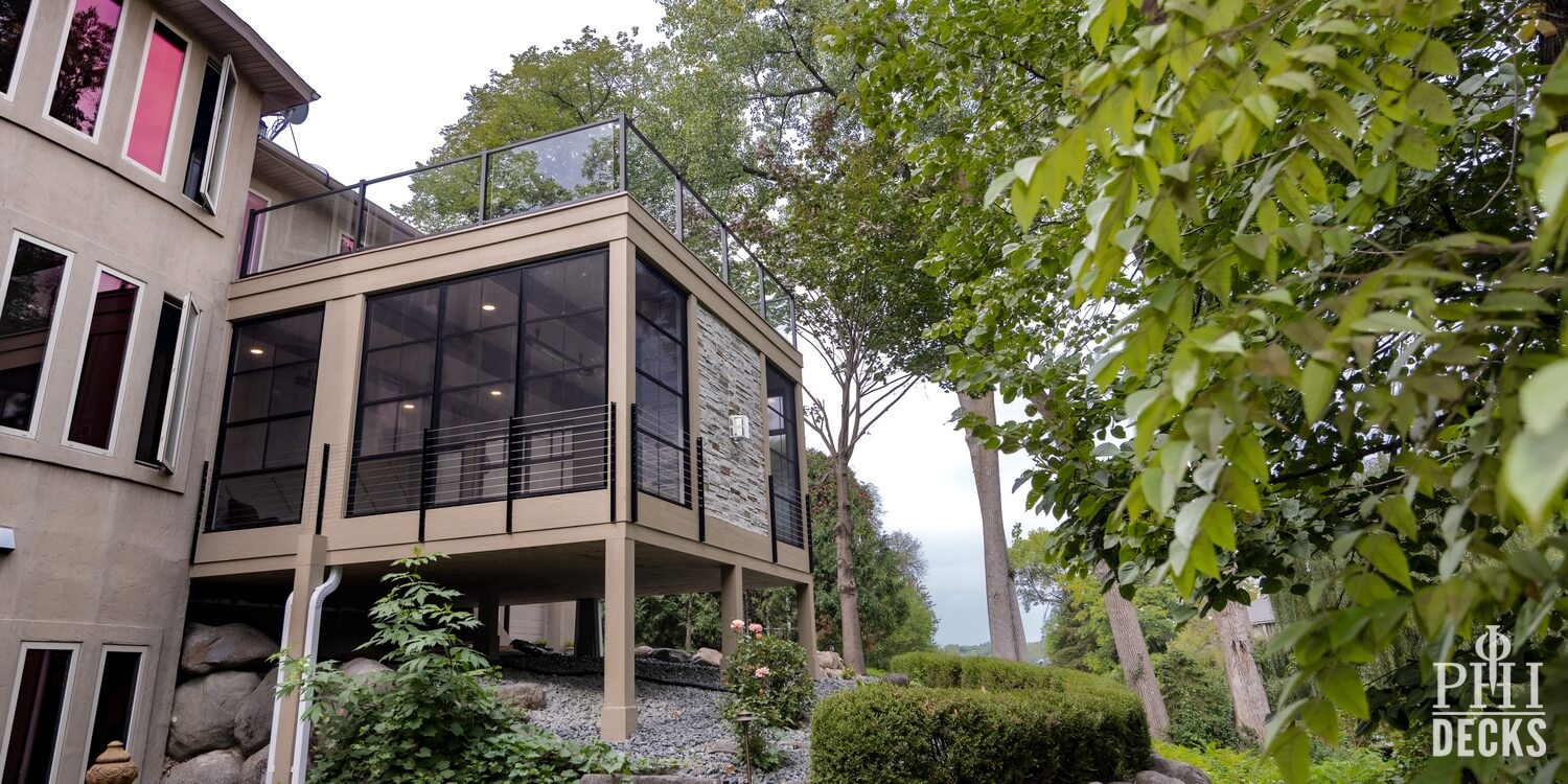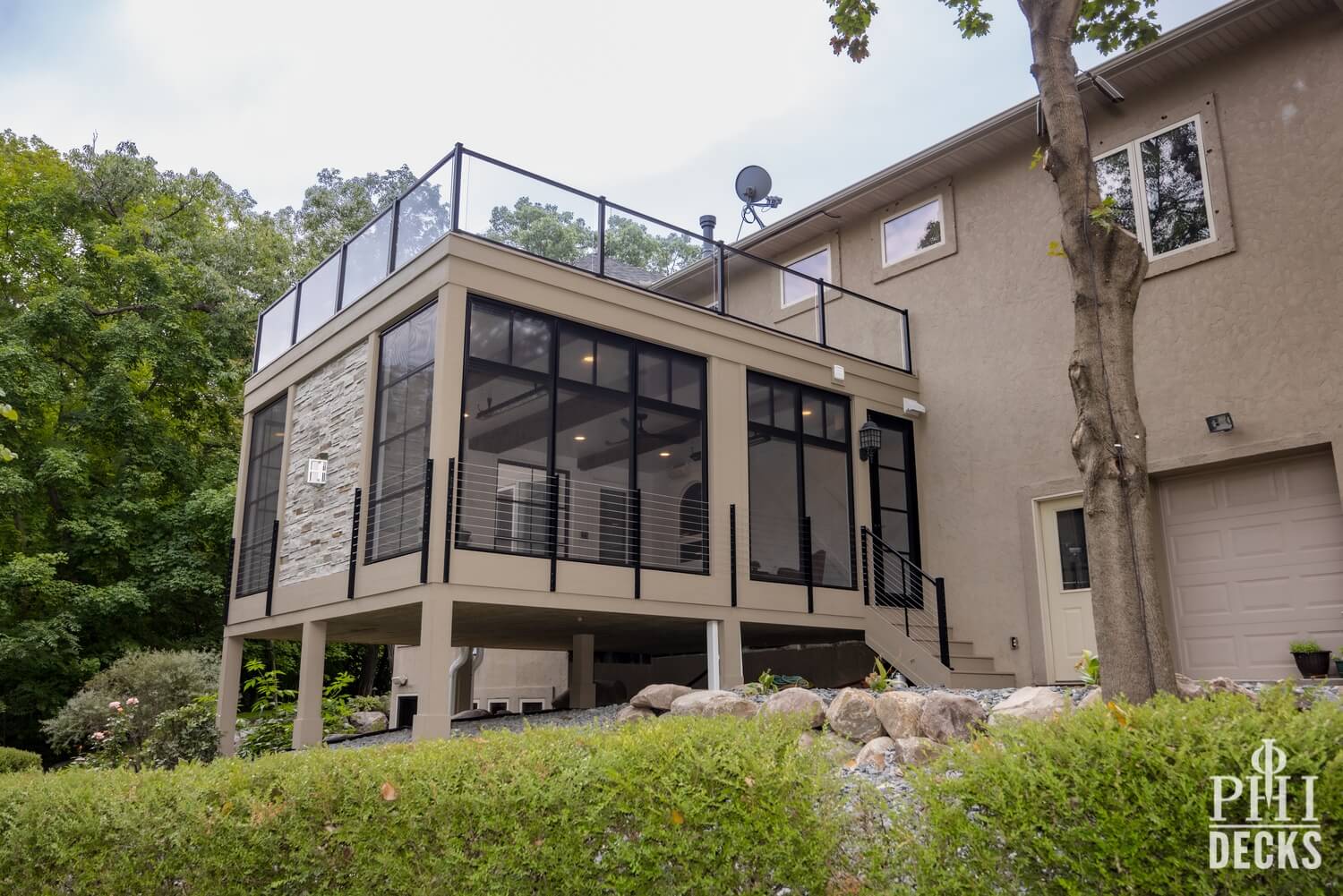 The Stone Ridge Porch is a stunning elevated retreat designed to blend warmth, structure, and sweeping views into one seamless outdoor living experience. Set atop a natural ridge, this three-season porch features expansive, black-framed windows that invite in light while maintaining a strong architectural presence.