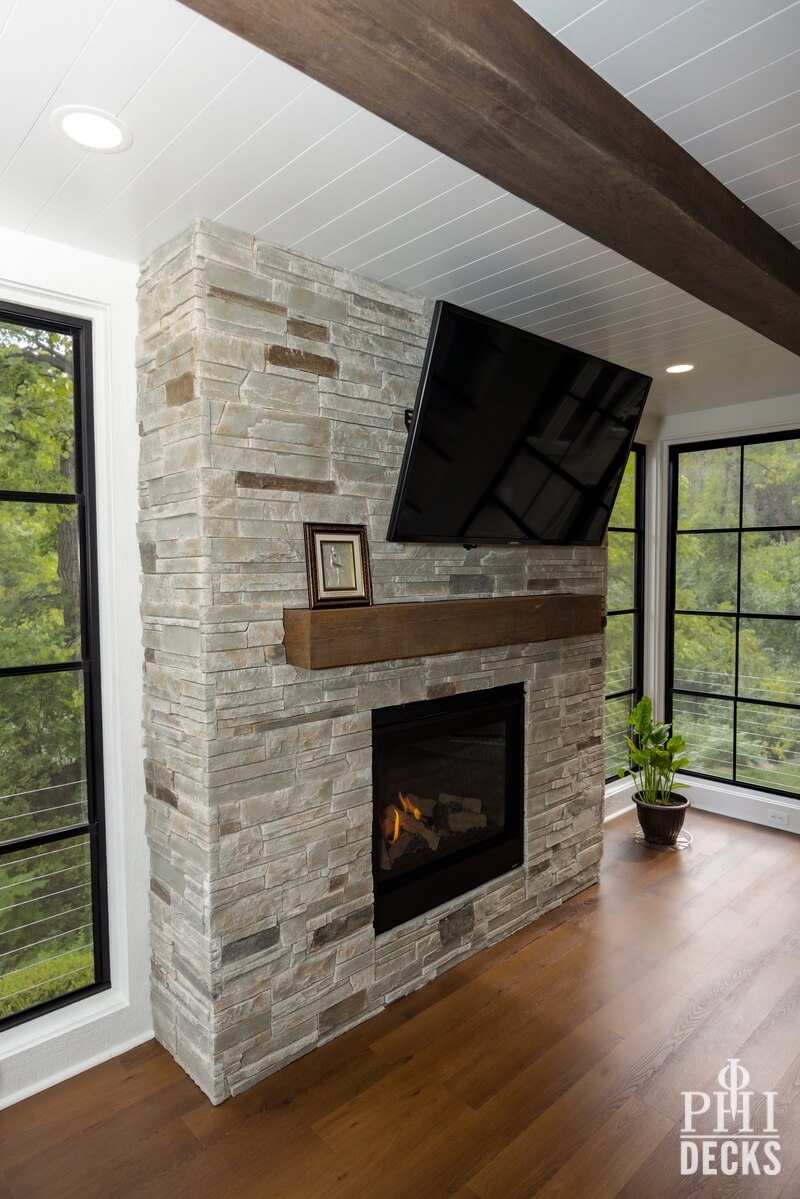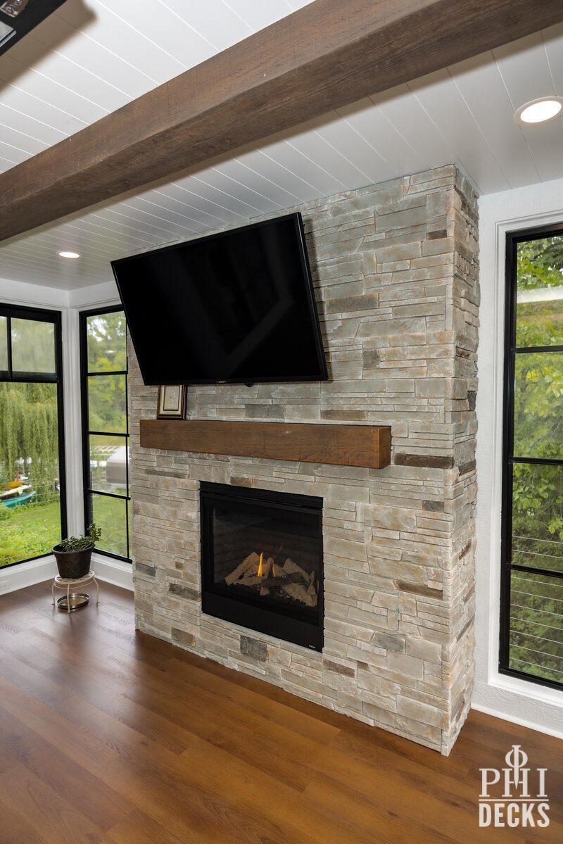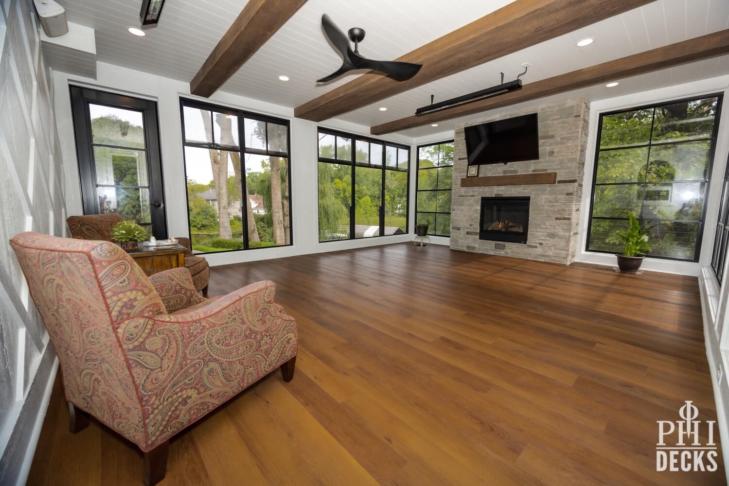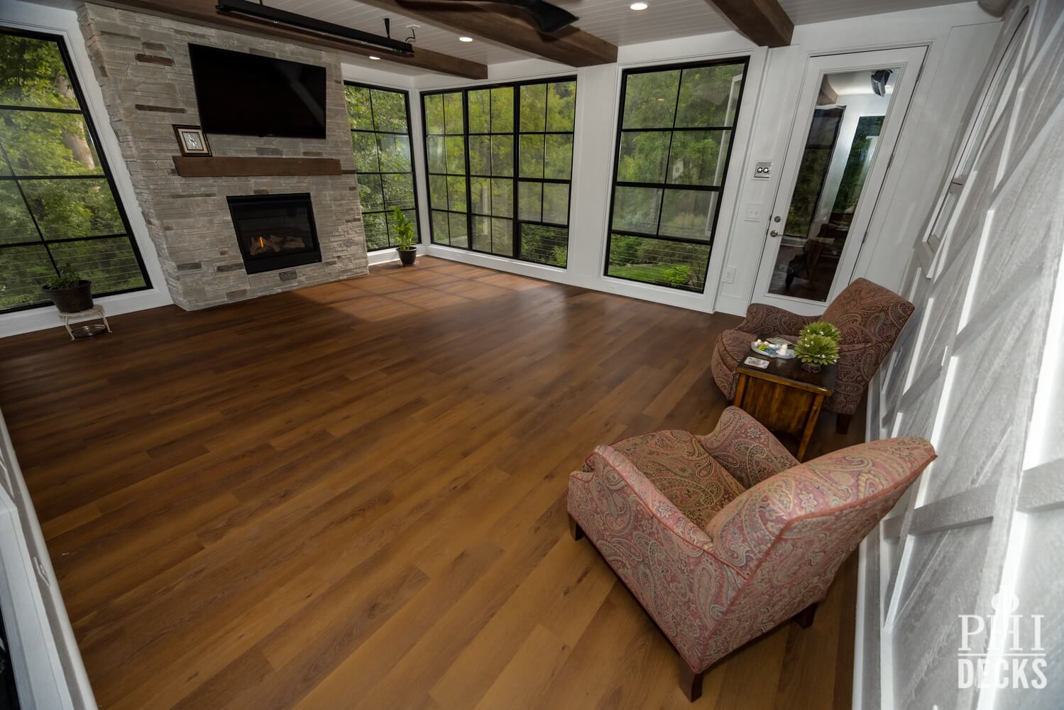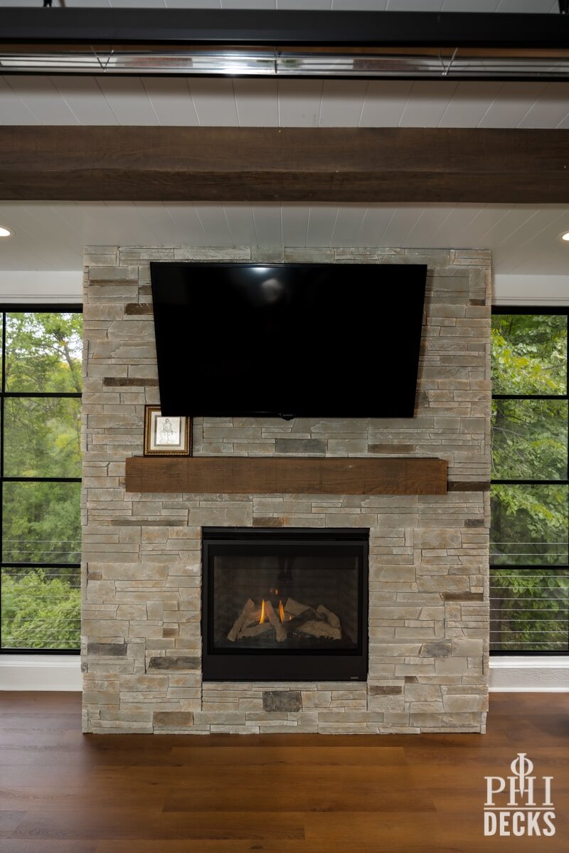 At the heart of the space, a floor-to-ceiling stone fireplace creates a cozy focal point, anchoring the room with texture and warmth. Rich wood tones, clean-lined finishes, and thoughtfully integrated details, from the ceiling beams to the luxury flooring, bring balance to the modern design.