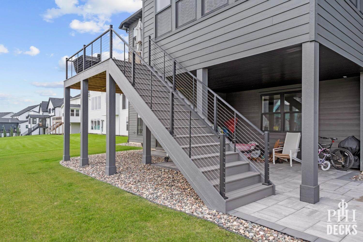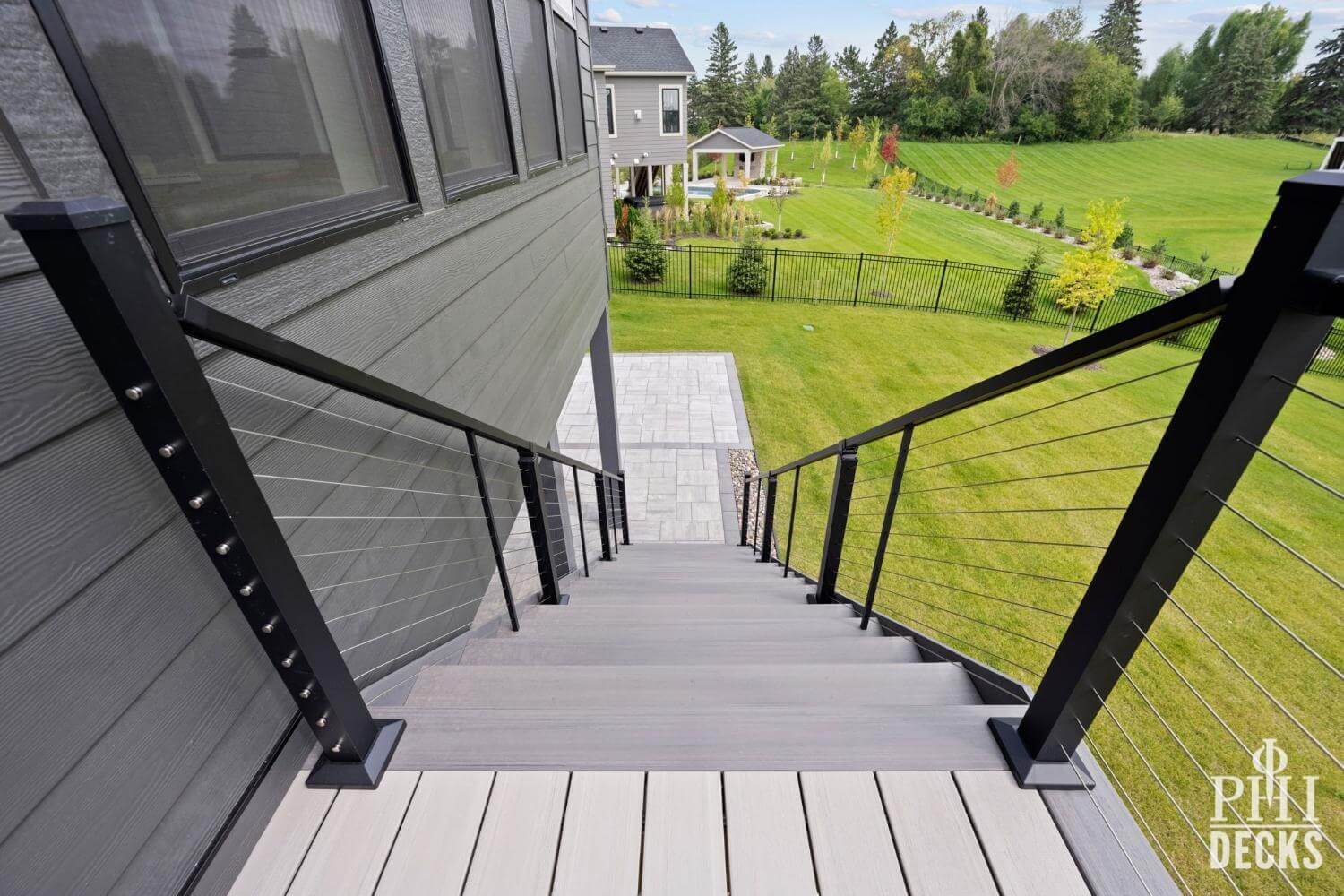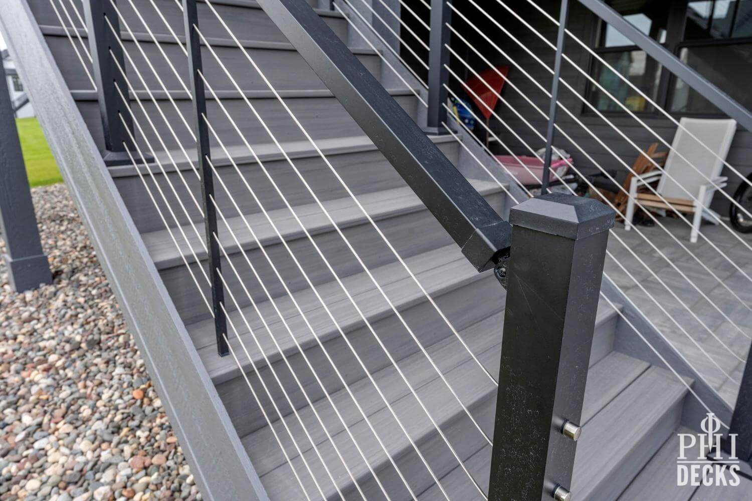 The deck surface is finished with TimberTeck decking installed with hidden fasteners for a clean, modern look, along with picture-frame borders and color-coordinated stair treads. The design includes wide stairs to grade, low-maintenance trim, and sleek aluminum railings with stainless steel cable infill, creating an open, contemporary feel while maintaining safety and code compliance.