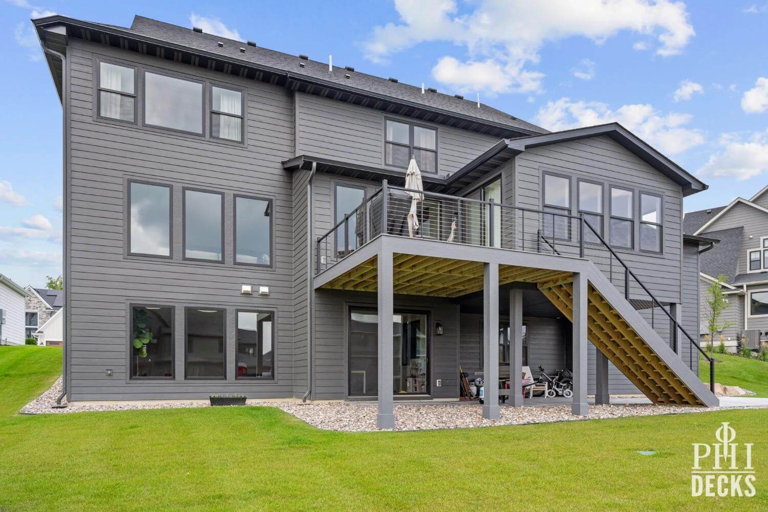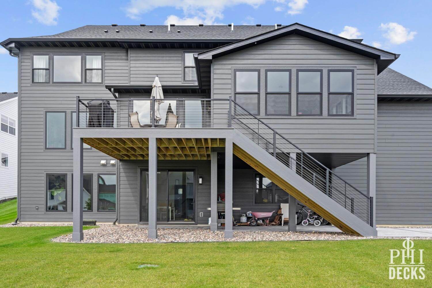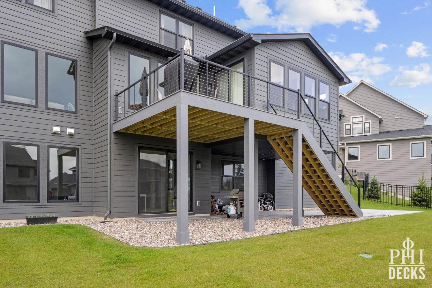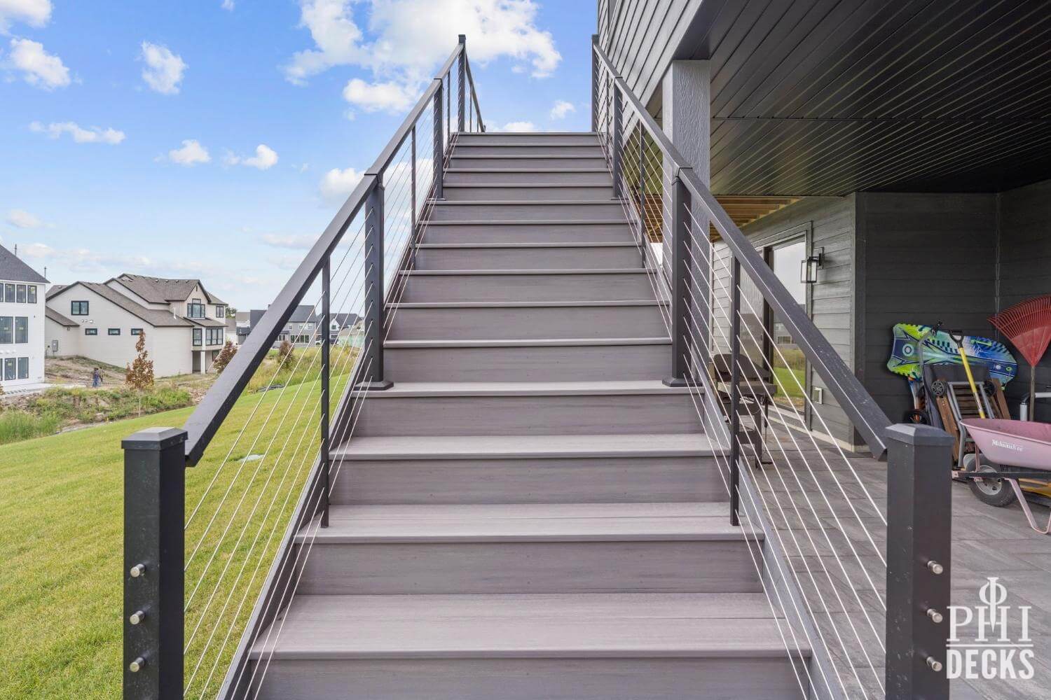 The deck surface is finished with TimberTeck decking installed with hidden fasteners for a clean, modern look, along with picture-frame borders and color-coordinated stair treads. The design includes wide stairs to grade, low-maintenance trim, and sleek aluminum railings with stainless steel cable infill, creating an open, contemporary feel while maintaining safety and code compliance.