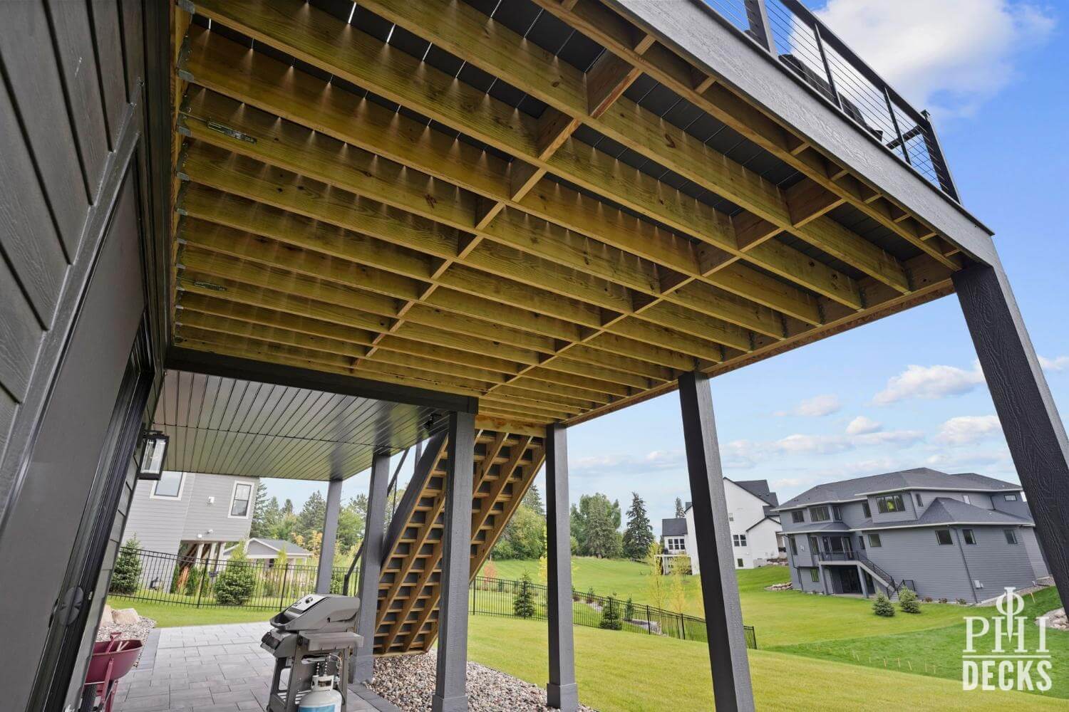 This custom elevated deck was designed to create a seamless outdoor living space with easy access to the backyard. Built on helical pier footings for long-term stability, the structure features treated support posts, flush beams, and closely spaced joists for superior strength and durability.