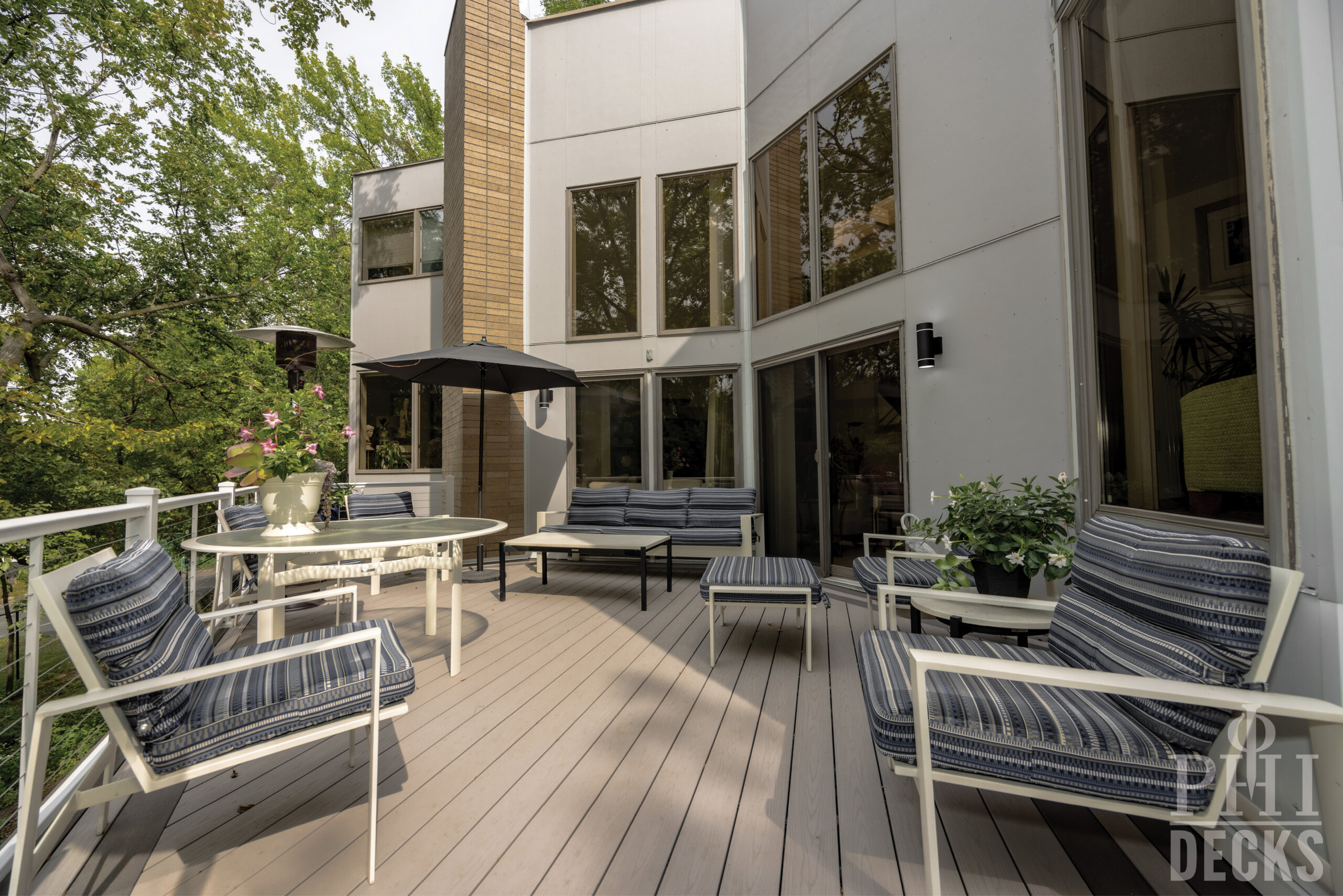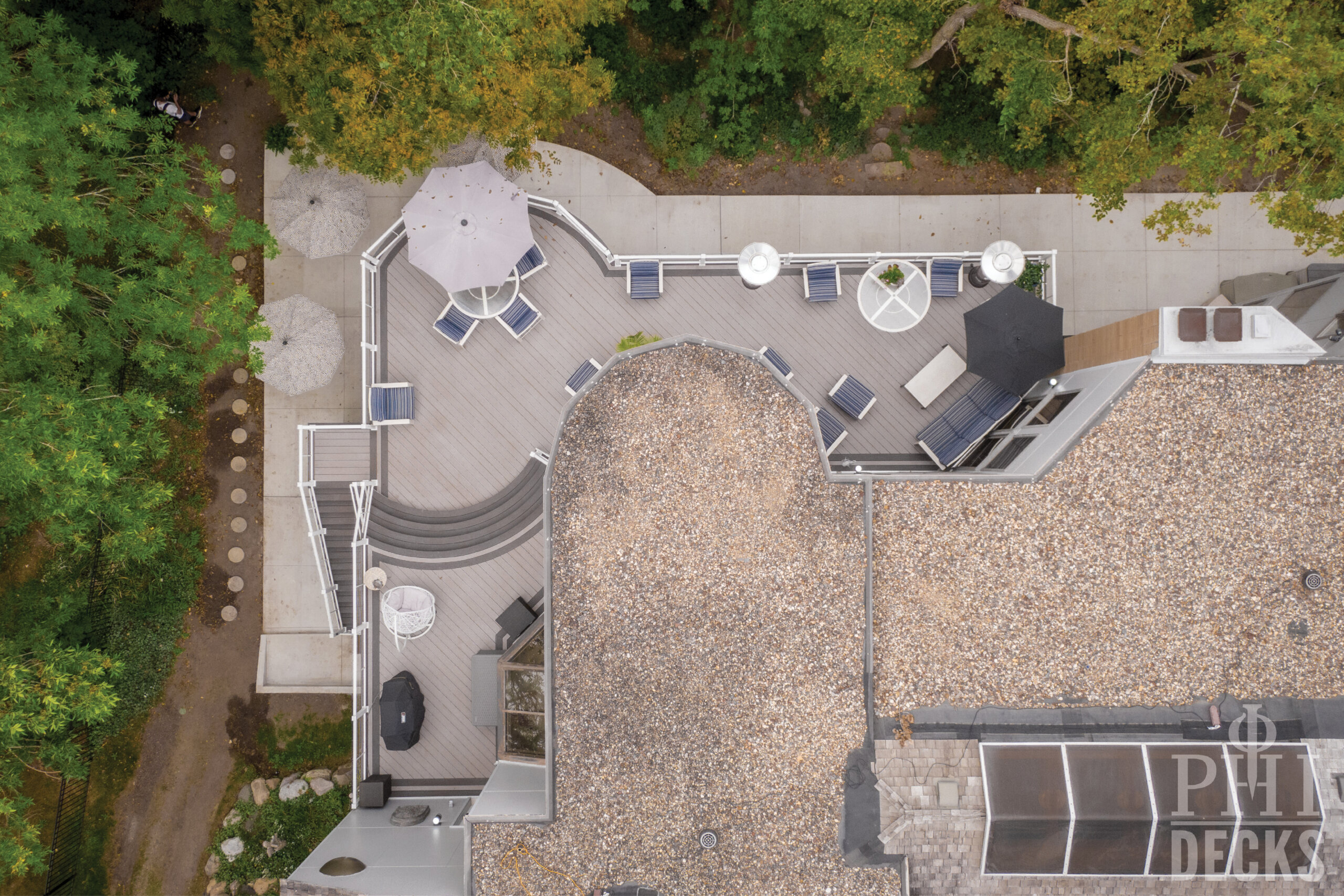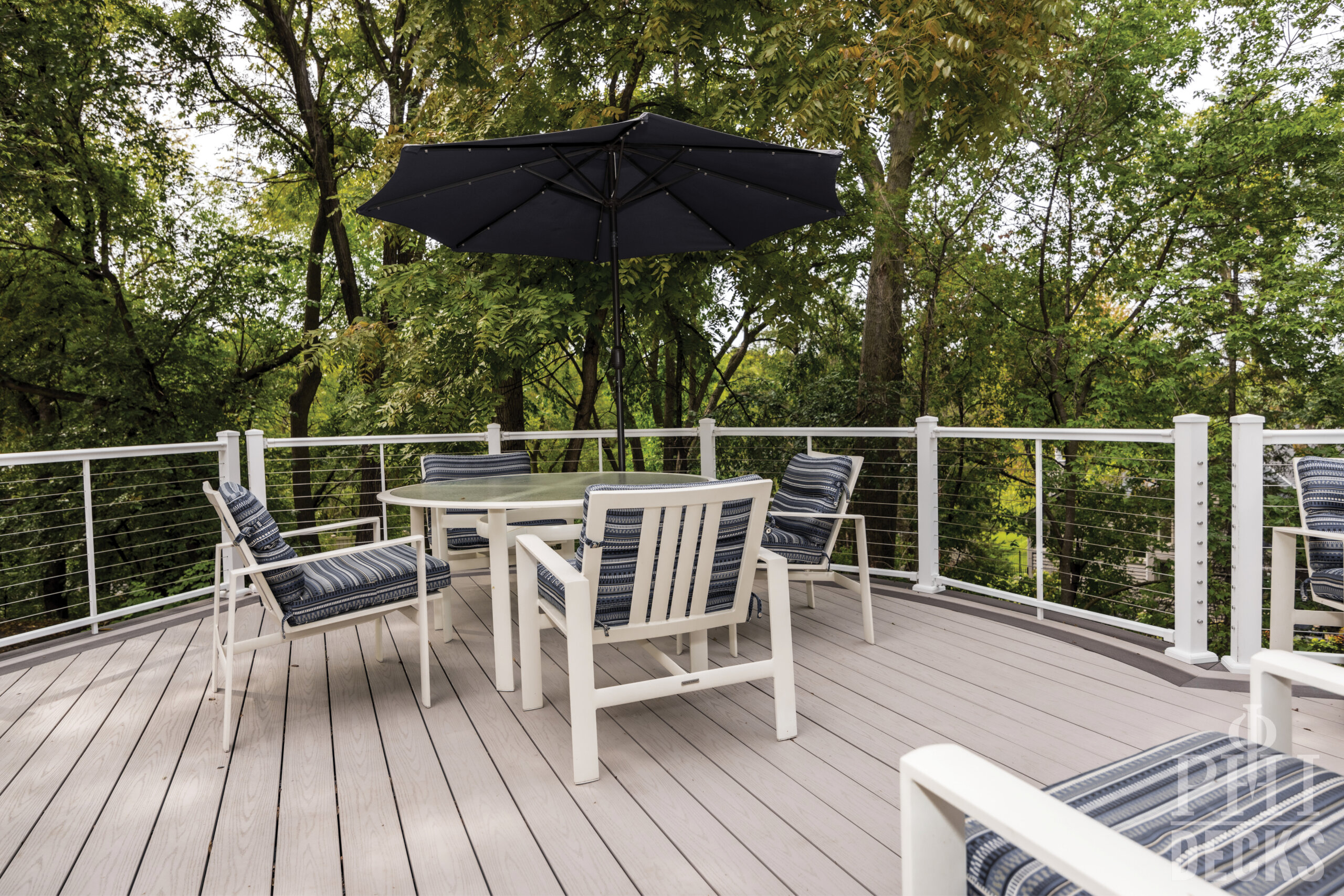 Low maintenance materials were selected to ensure long term performance without sacrificing appearance. The decking provides a clean, refined surface underfoot, while aluminum railing offers safety and durability with a minimal visual footprint, allowing the surrounding wooded views to remain the focal point.